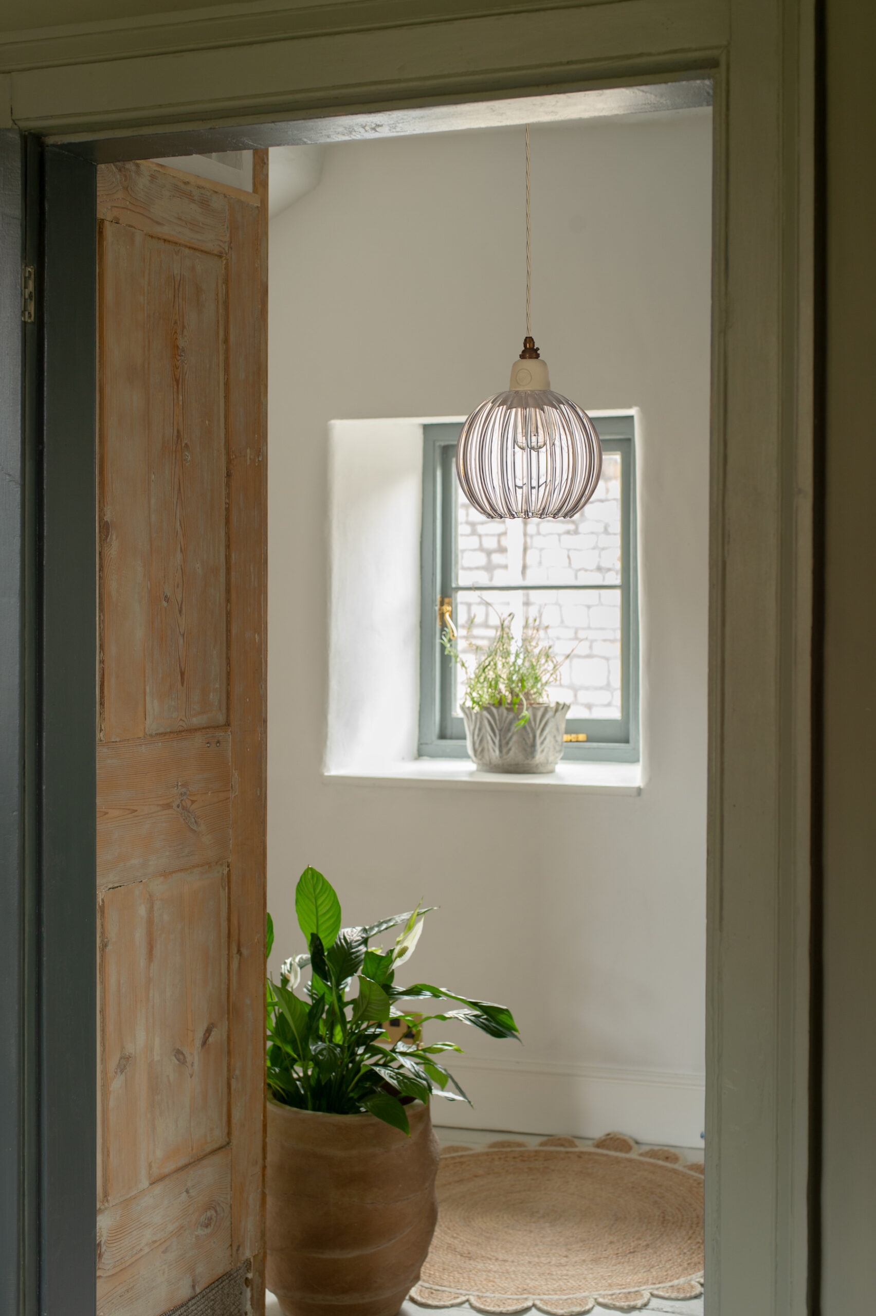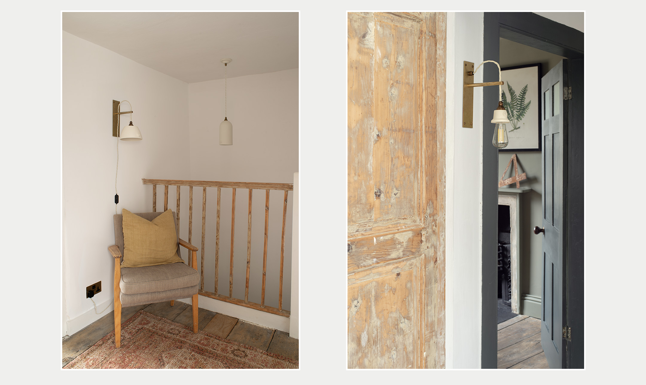 On one landing, a fluted Millais pendant hung near the window. Its curved glass caught the afternoon sun and reflected it gently across the pale walls. The second-floor landing, low on natural light, gave us the perfect place to trial the plug-in Boxted again, this time with a Delphinium shade and exposed pear bulb, casting a soft, ambient glow. On the ceiling, a single Brontë offered a focused light for the staircase below.