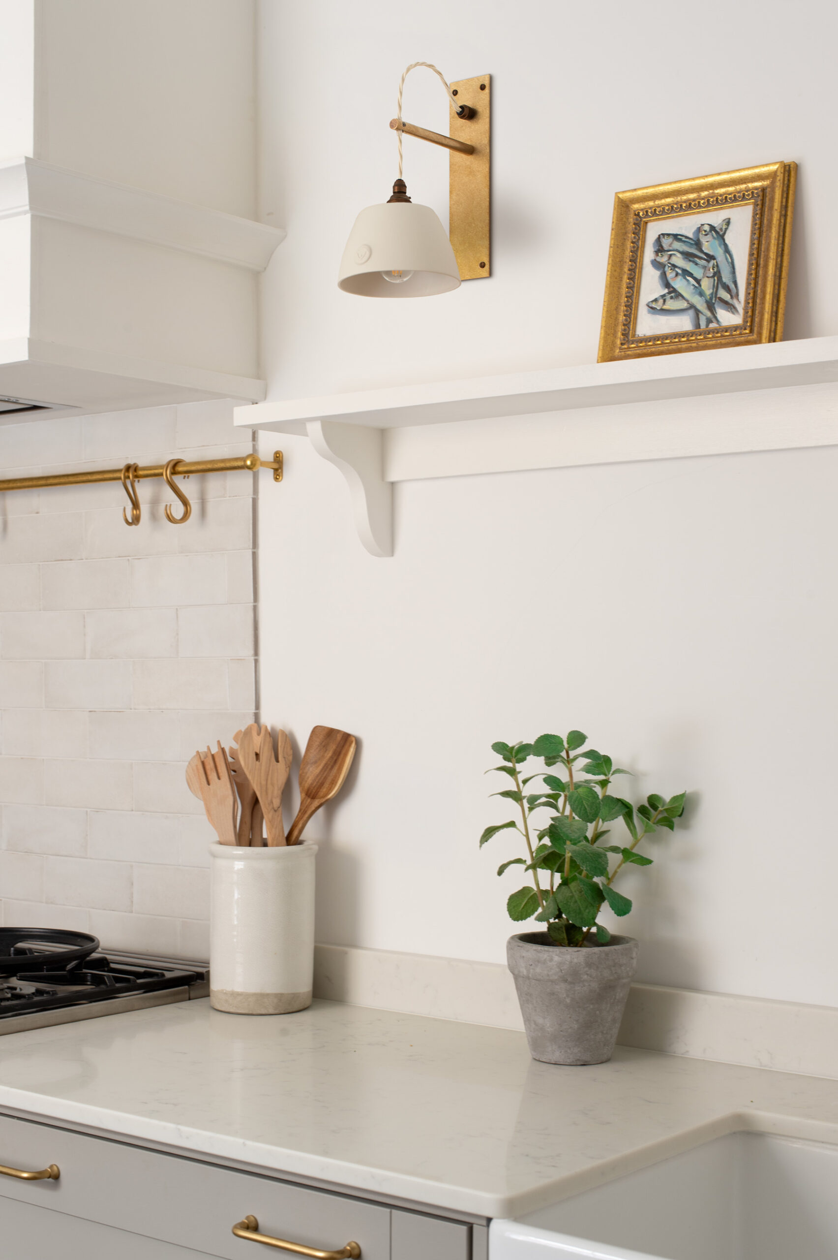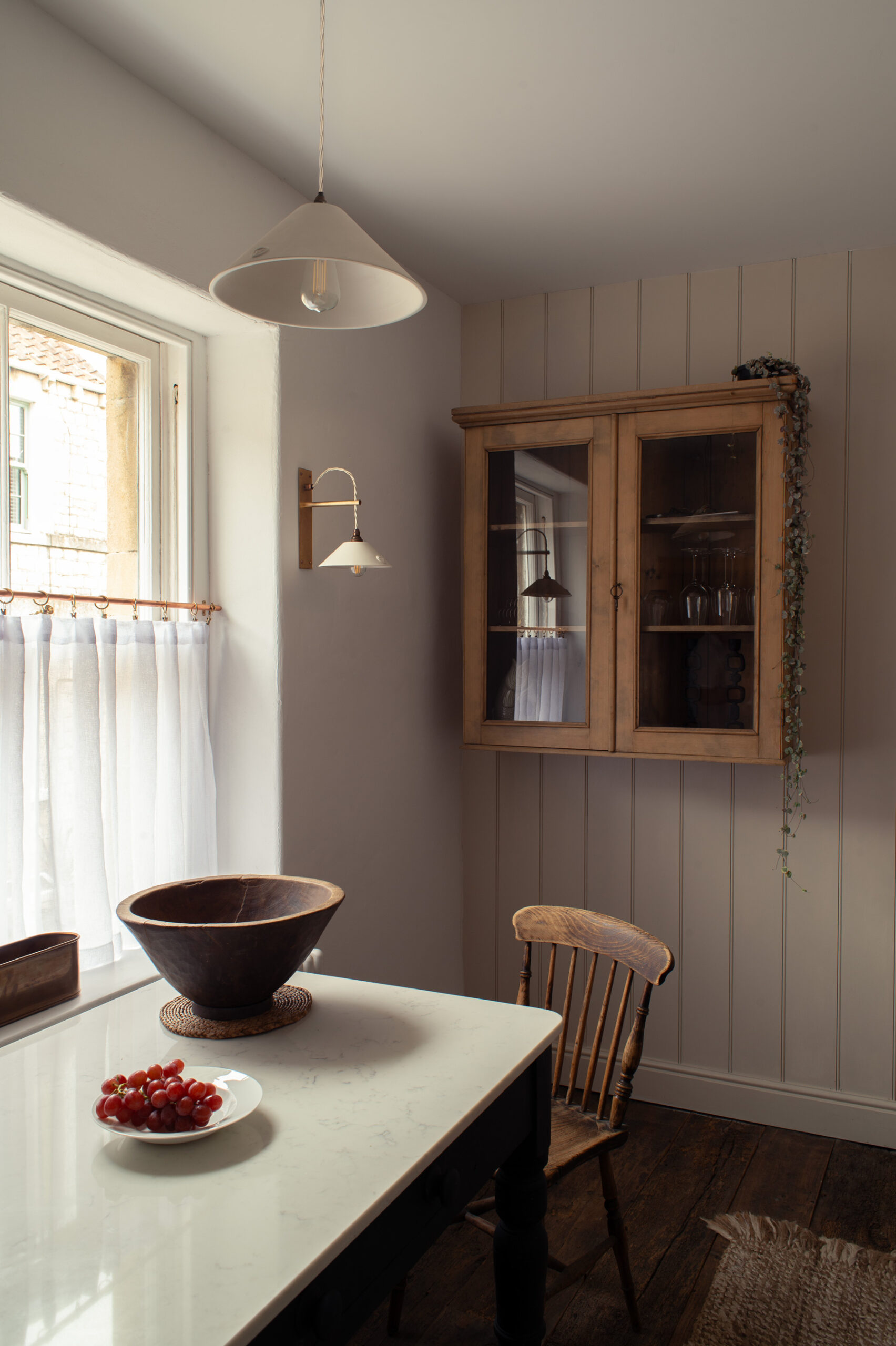 Returning to No.4, the kitchen had transformed. The morning’s softness had shifted to a bright, welcoming light. We installed a Large Keats pendant above the table, and paired the Boxted with both the Cottage and Small Keats shades. Their finishes, natural brass, soft porcelain, created a harmony that felt considered but never forced.