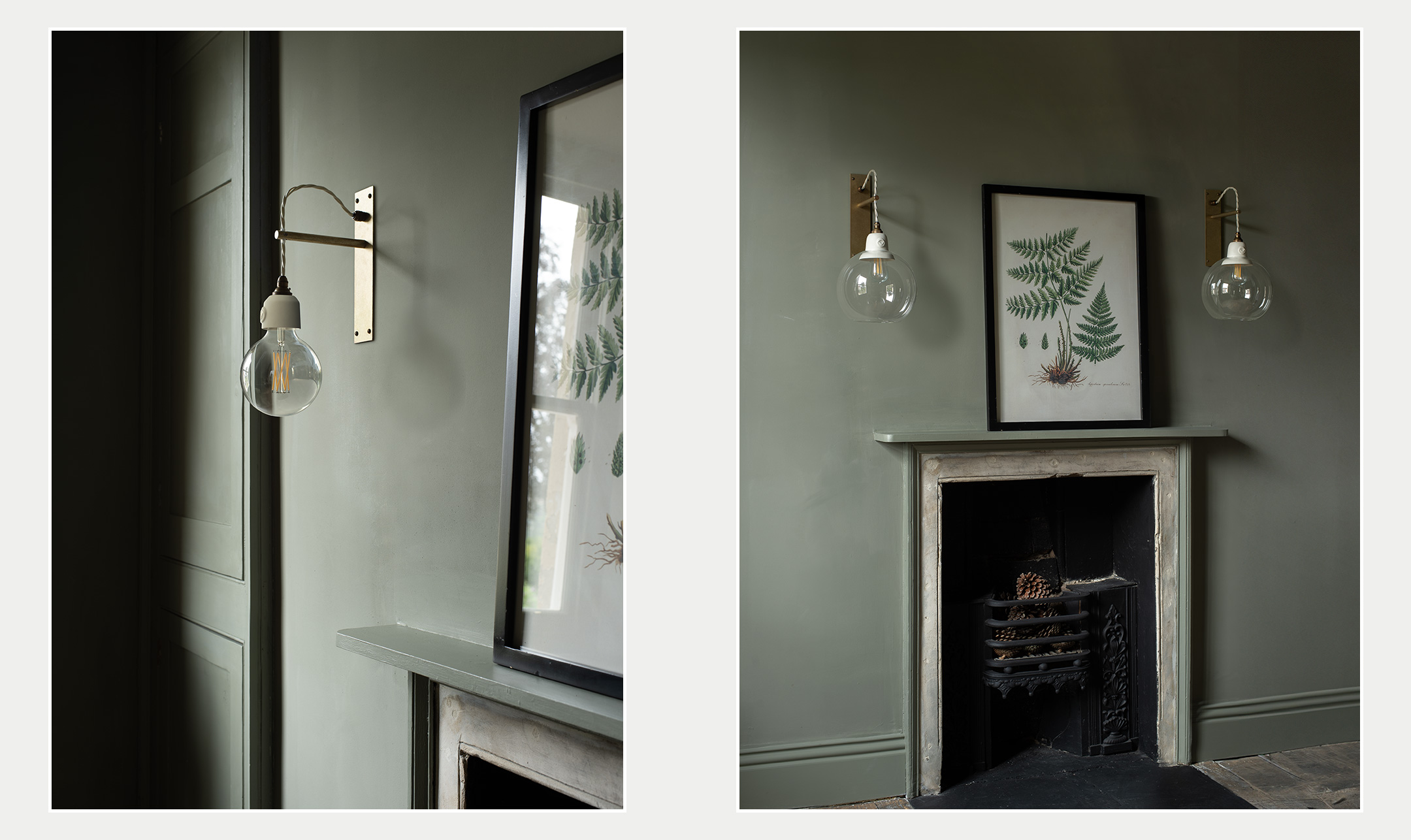 One floor up, the living room shifted into something more dramatic. Dark green walls, worn leather, and generous sash windows created the perfect backdrop for the Boxted. A large Keats pendant offered a bold centrepiece, while on the walls we alternated between small Keats shades and the refined simplicity of Constable glass. A single Acanthus with a globe bulb echoed the clean form of the Constable, while the curving lines of the Ophelia, also tested here, caught the light with elegance.