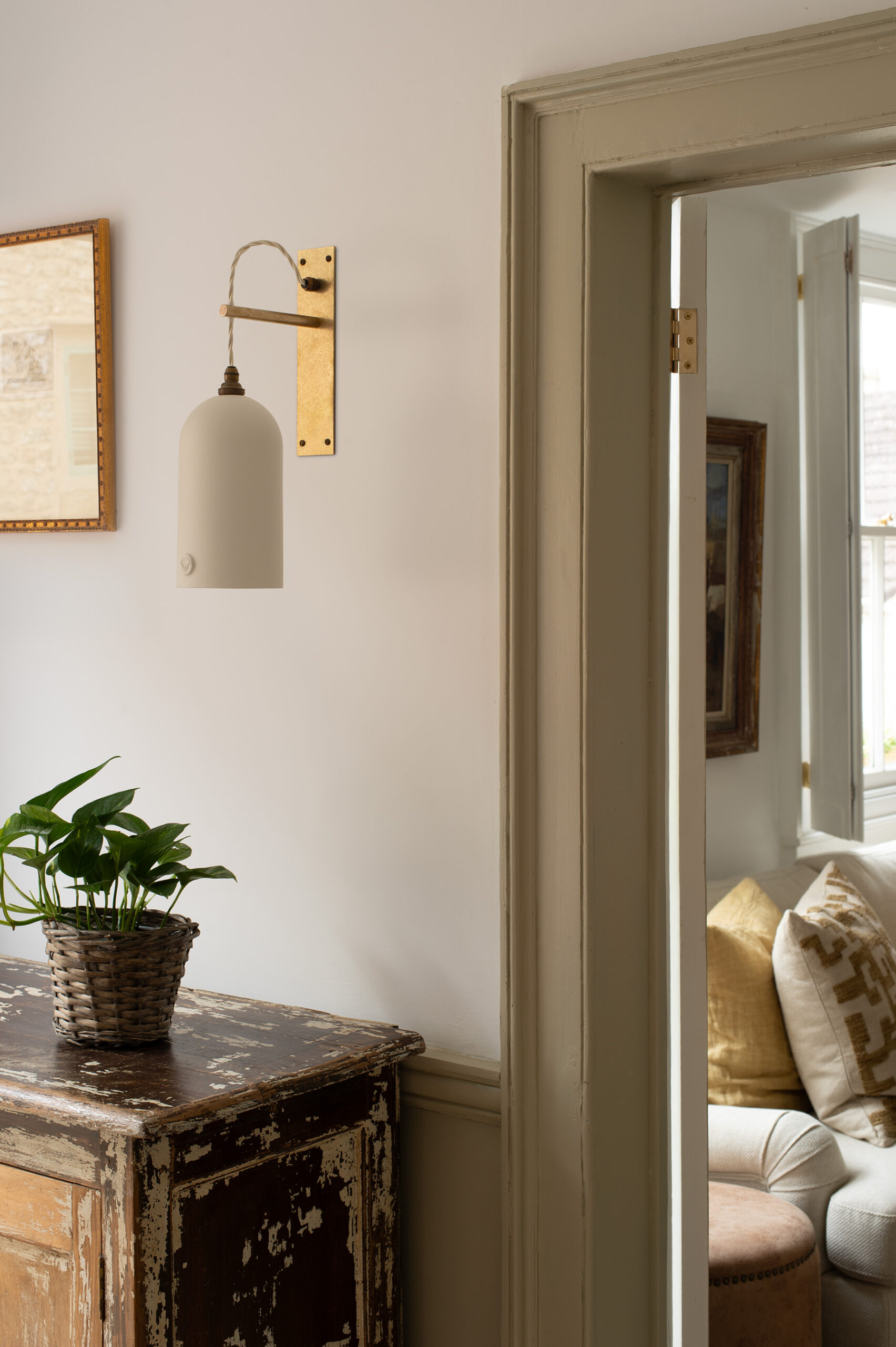 The hallway greeted us first. As you step in through the front door, a soft diffusion of light reveals textured woodwork and earthy tones. We paired the Boxted bracket with a domed Brontë shade, its form sculptural, in the natural light. The fluted glass of the Millais shade caught the light like water, while a plug-in version of the Boxted provided a quiet solution on the lower wall. The Fonteyn’s shallow cone offered a geometric contrast, and the Cottage shade lent a more traditional silhouette. It was an ideal starting point – calm and considered.