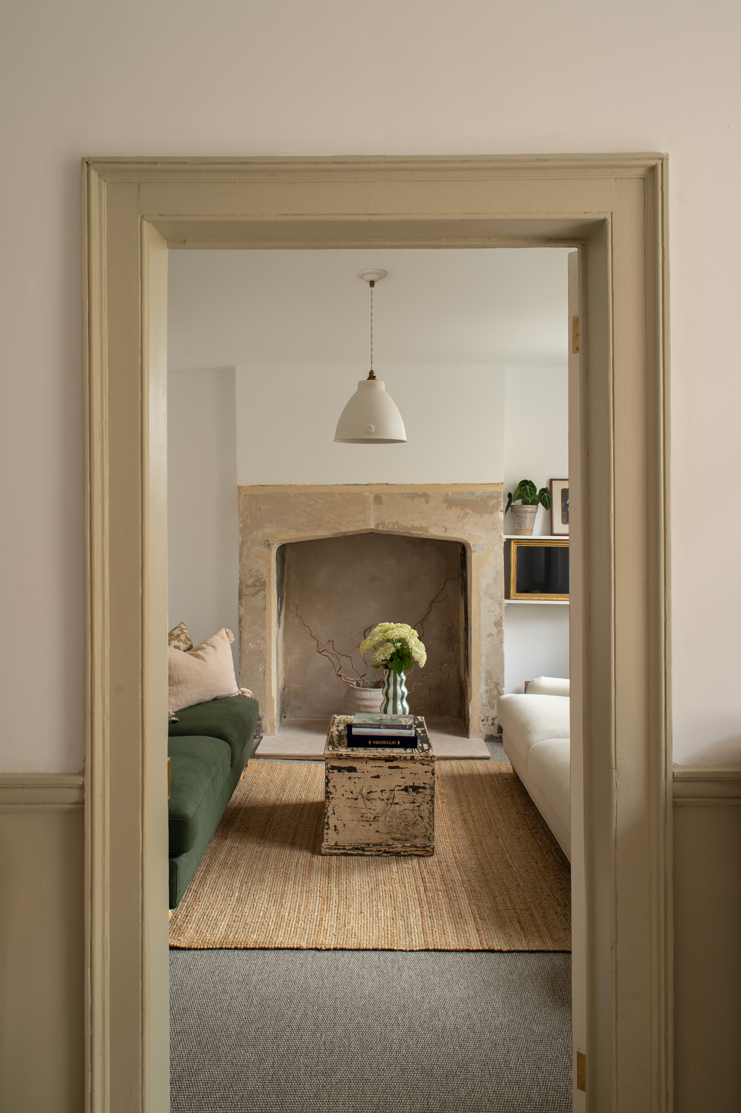 To the left of the hallway, the ground floor sitting room offered a moment of stillness. Here, we kept things simple with a single Ophelia pendant suspended above a rustic, timeworn chest. The softness of the light echoed the softness of the furnishings, while the stone hearth anchored the space.