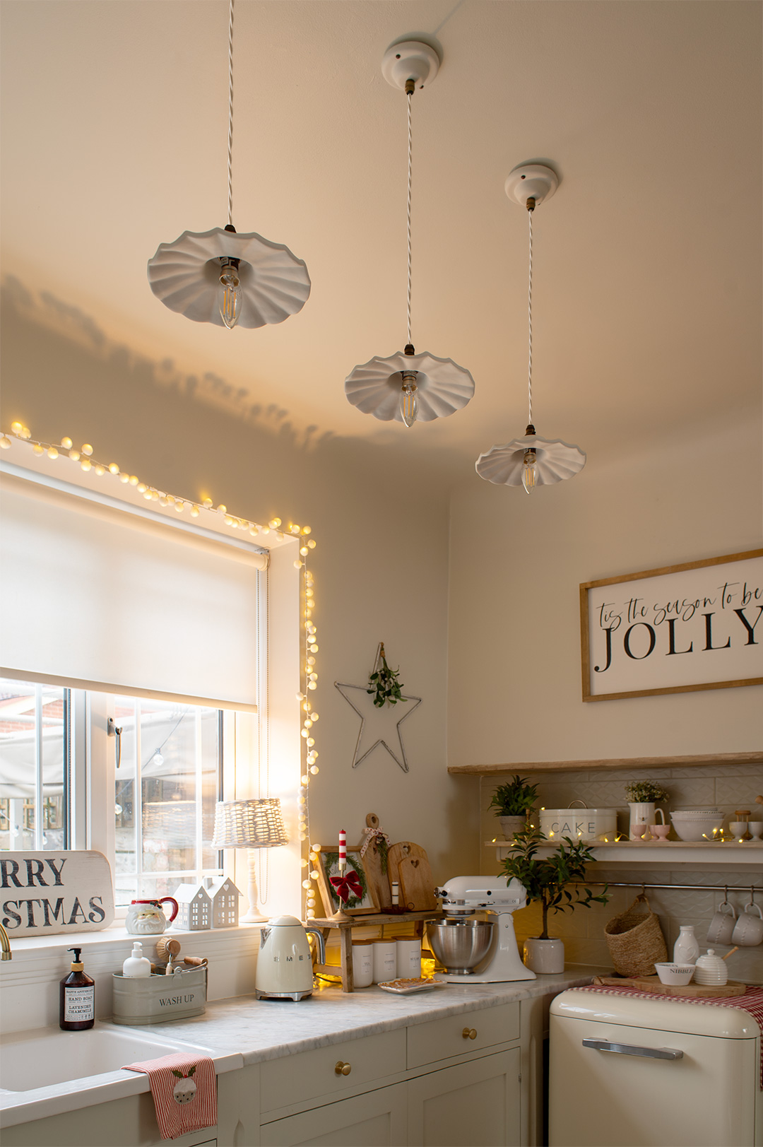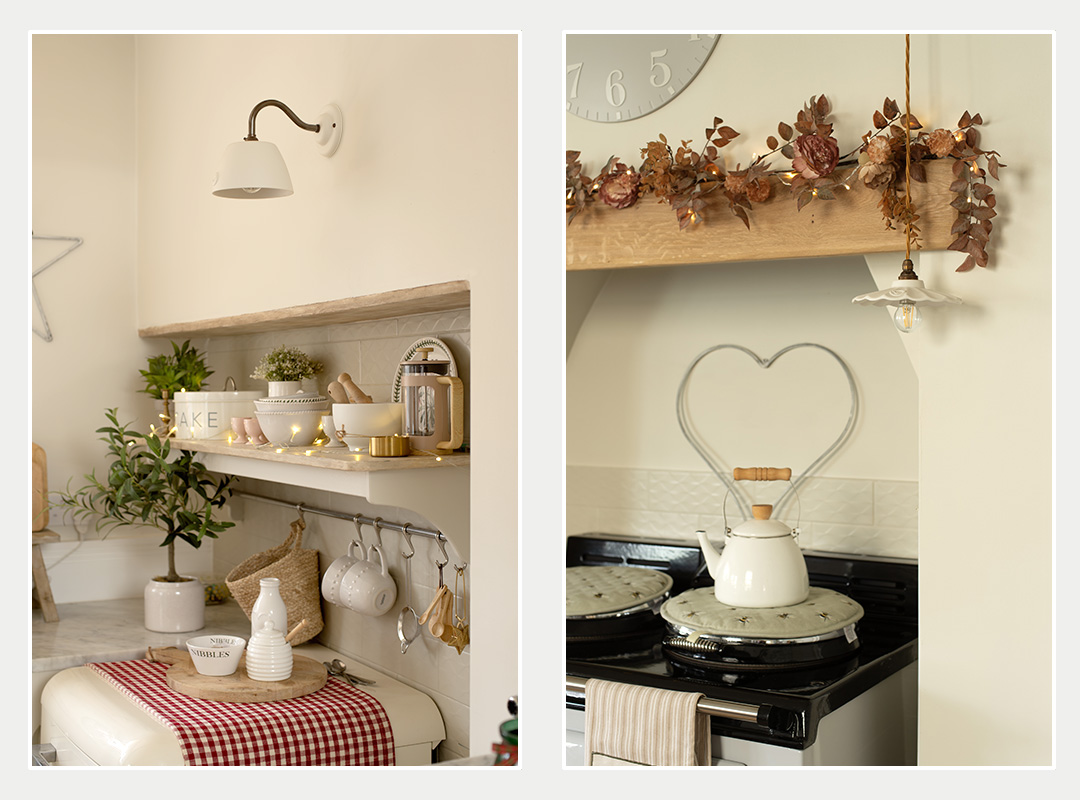 Elsewhere in the kitchen, the story continues. A plug in petite Giselle above the Aga adds a softer, more intimate note, while a Bergholt Cottage wall light brings warmth to a quieter corner. Together, the full family of Giselle sizes coexist naturally, each serving a different purpose, yet speaking the same design language.