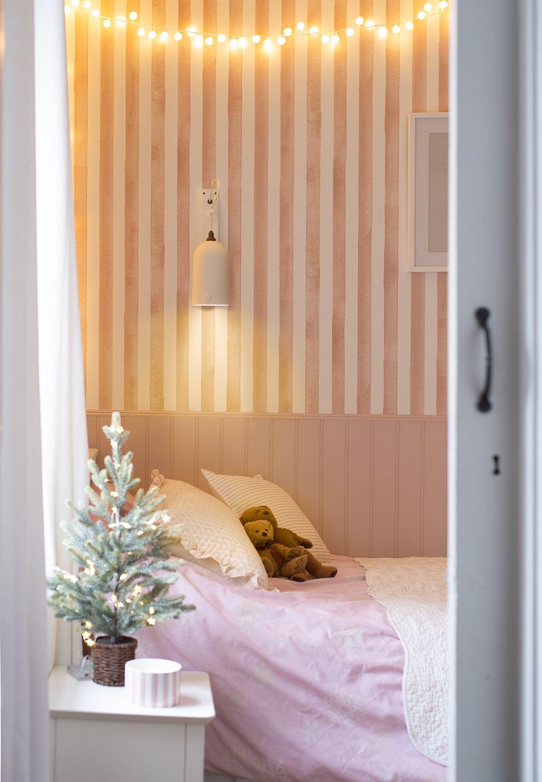 In one daughter’s room, the Giselle appears again, this time in its Bergholt wall light form, scaled perfectly for a child’s space. In the youngest daughter’s room, a Flatford Bronte brings vertical emphasis and focused light, working in harmony with the striped walls and creating a comforting, bedtime glow.