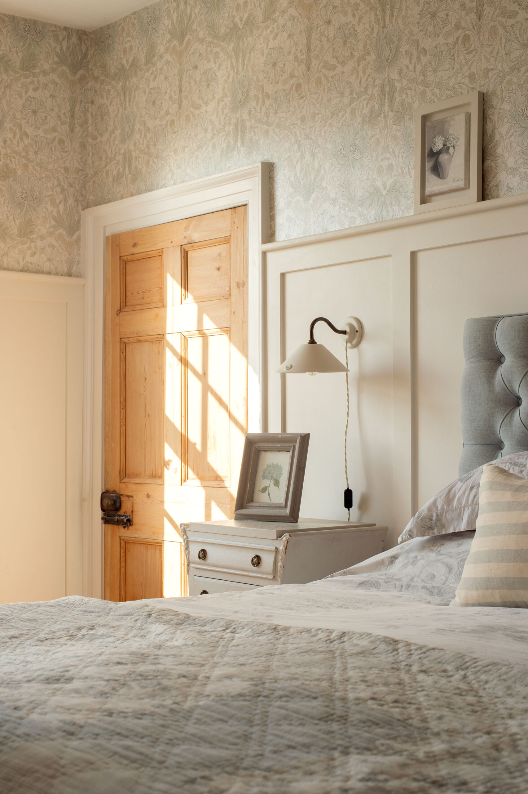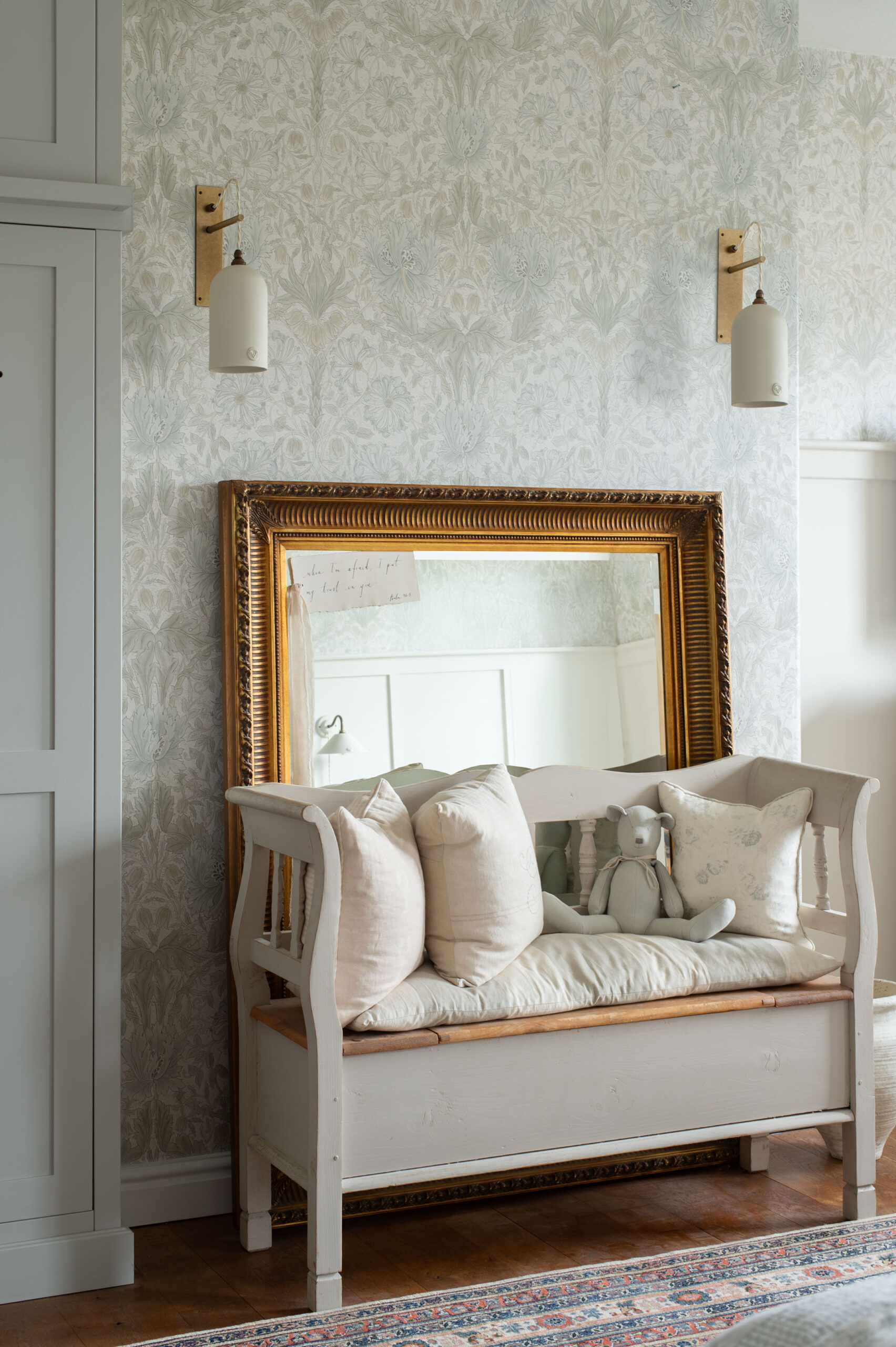 Upstairs, the light softened as the afternoon drew on and we discovered the bedrooms. Here the use of light felt even more personal. By the bedside, plug in Bergholt Keats Wall Lights provided a graceful solution where no wiring had been installed. Their form is delicate, their presence understated, perfectly suited to rooms defined by patterned wallpapers and soft textiles.