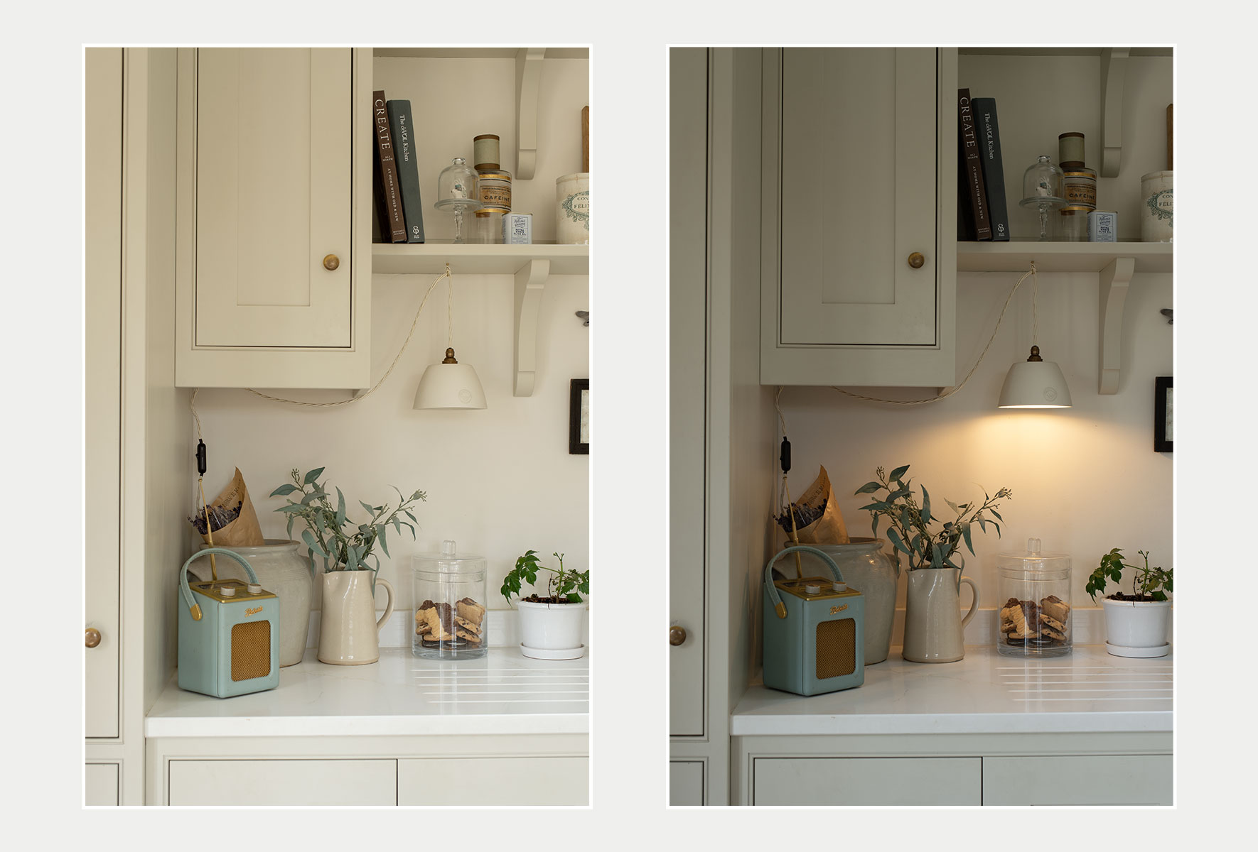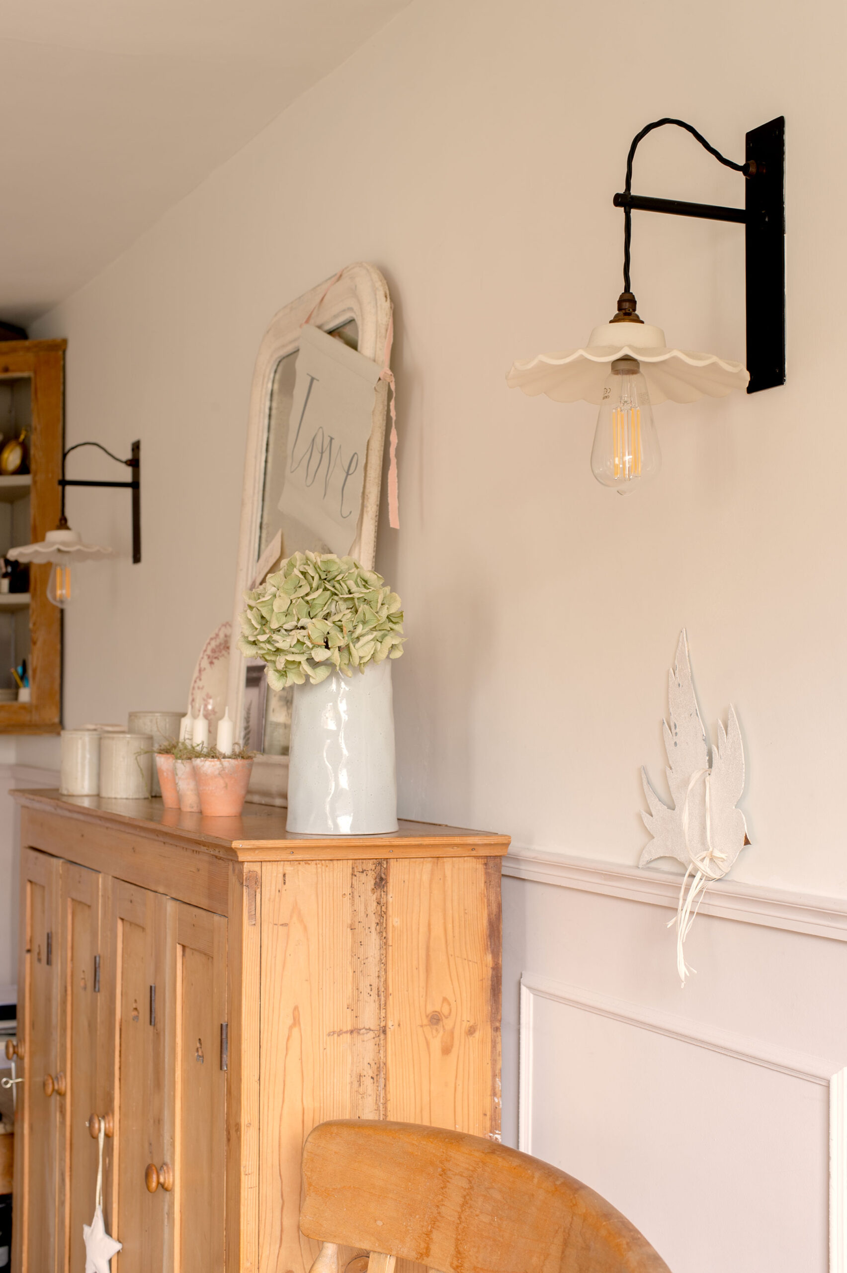 The sense of curation flows into the kitchen where natural light pours across a soft palette of painted cabinetry. This is a room that feels lived in yet finely balanced, practical yet deeply charming. Here Nicky chose to place a plug in Cottage Pendant, casually hung from an under shelf hook to bring task lighting to the work surface. It is a small detail, but one that captures her talent for combining simplicity with function in a way that feels completely natural.