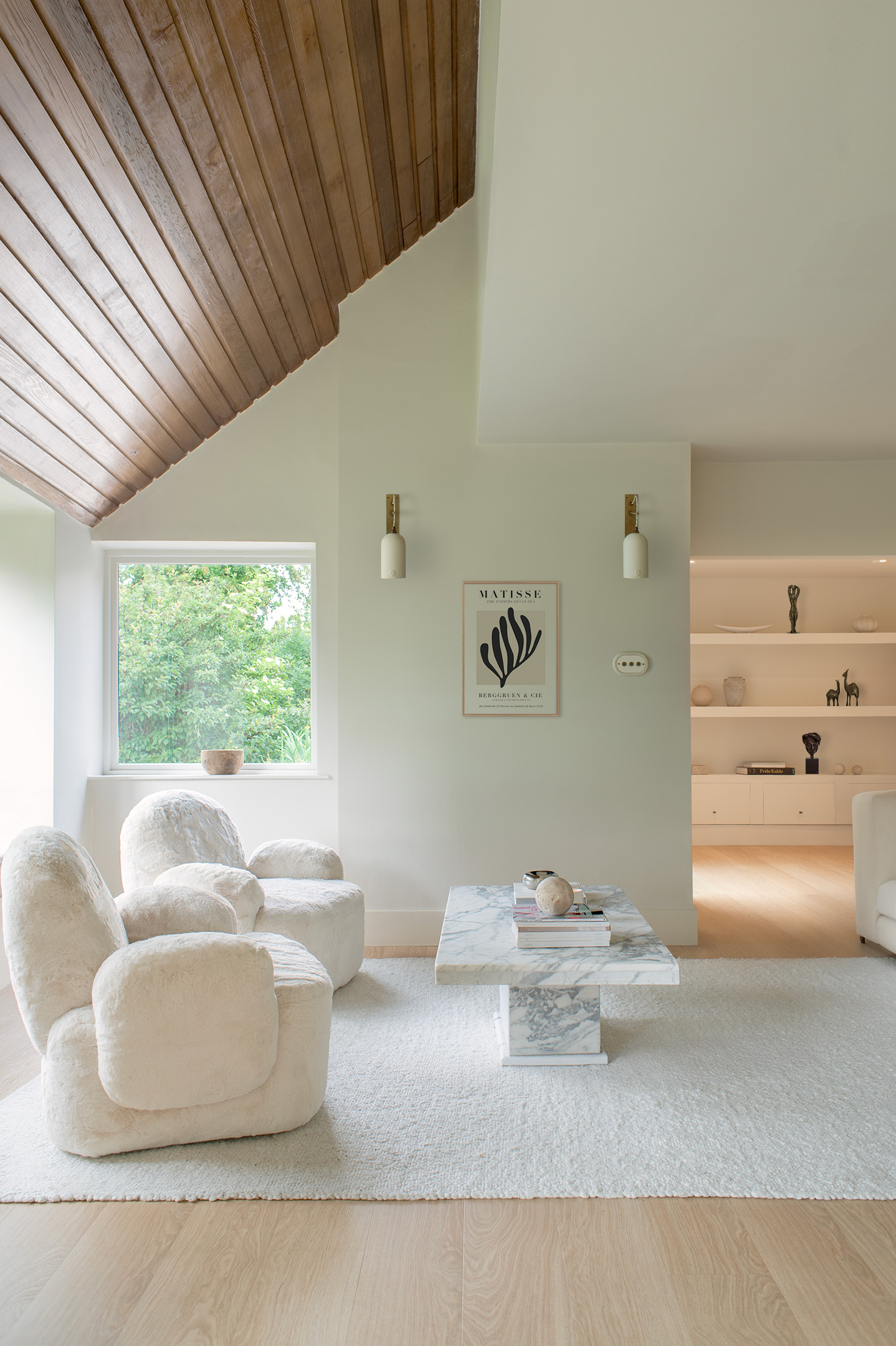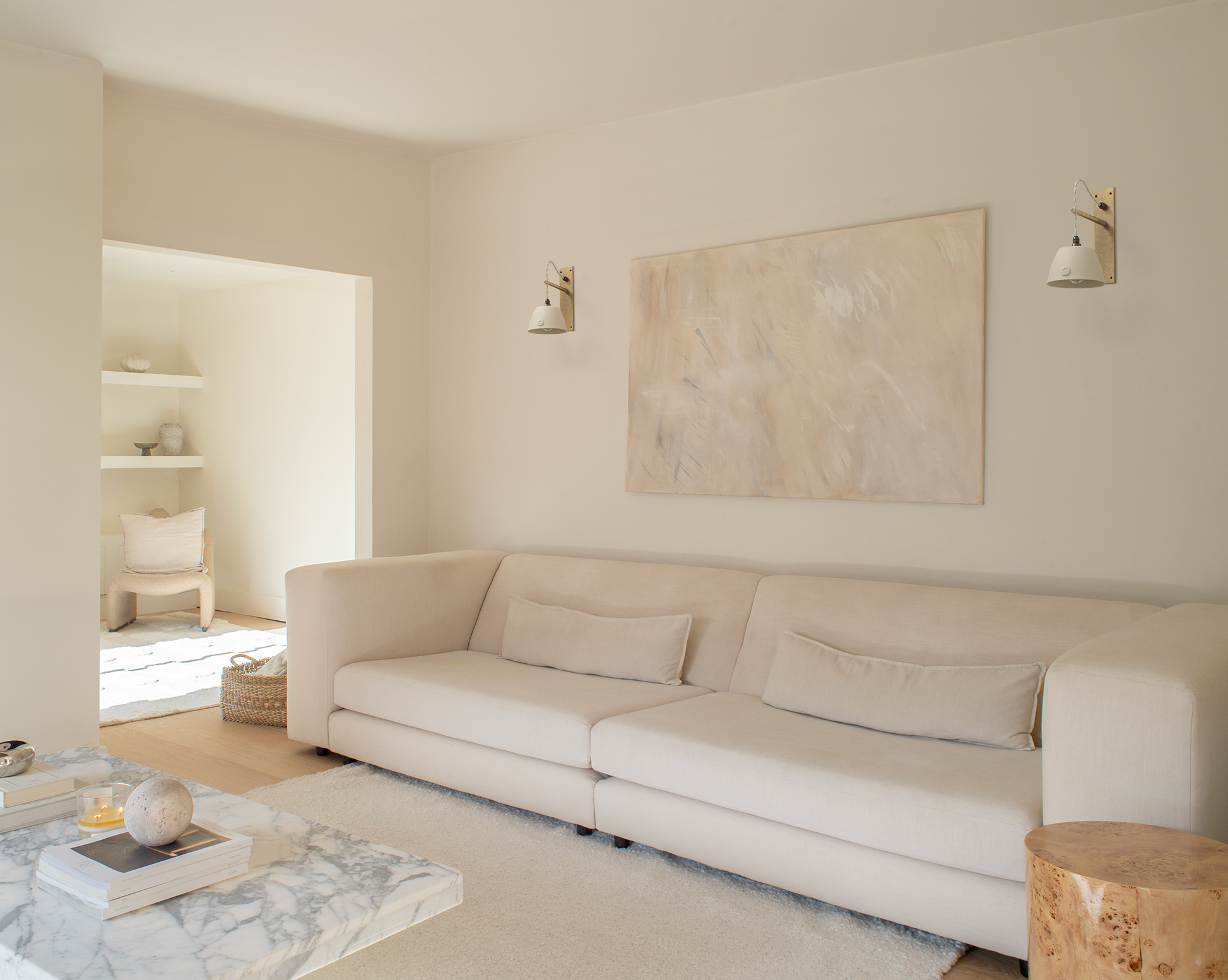 The home flows with ease. From kitchen to dining room to living space, the atmosphere remains calm yet rich in texture. In the living room, a shaggy rug grounds sculptural furniture and Gemma’s own abstract artworks. Flanking the painting, two more Boxted Wall lights provide gentle rhythm and continuity beneath the restored timber ceiling, a nod to the home’s mid-century past.