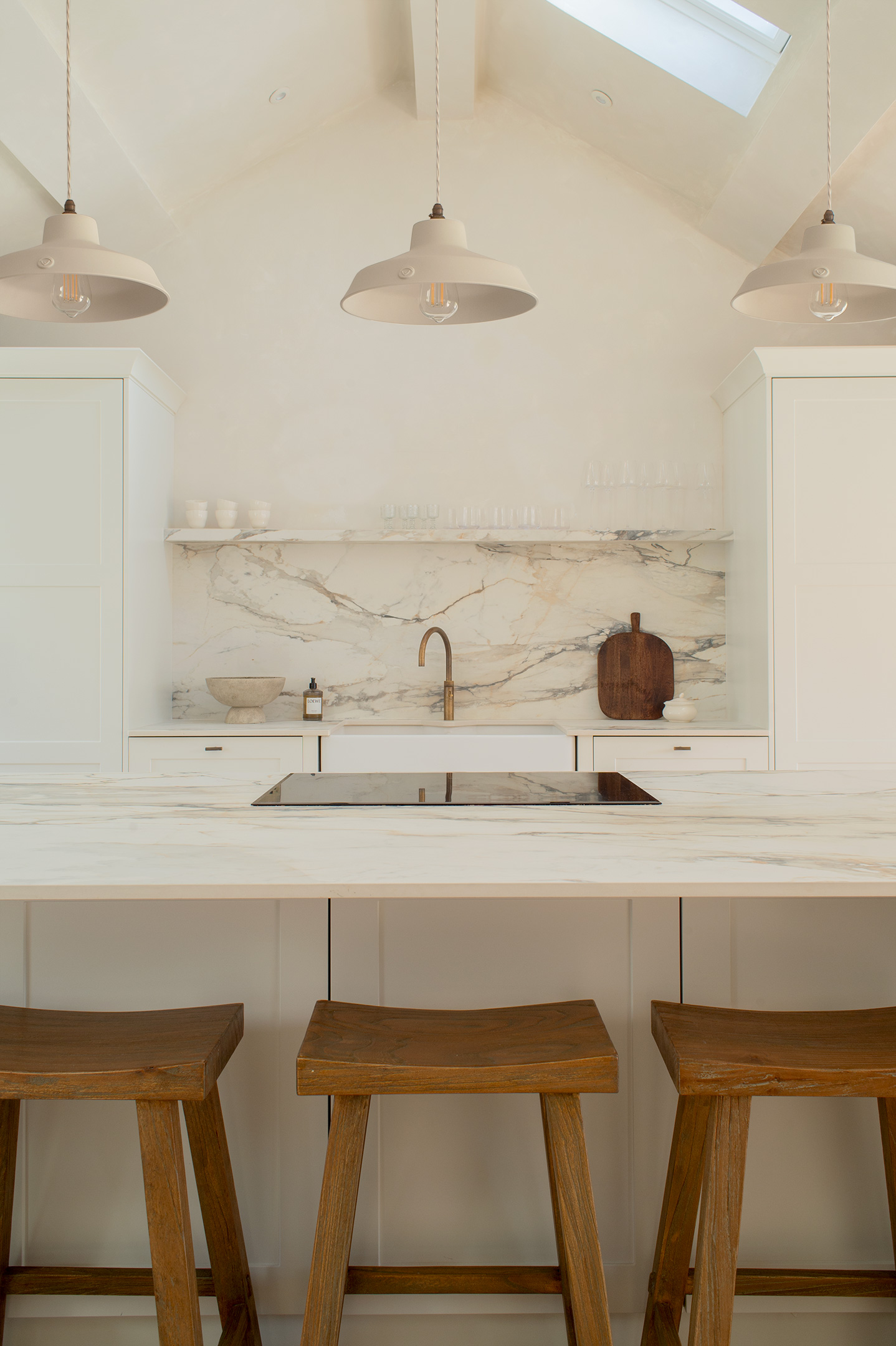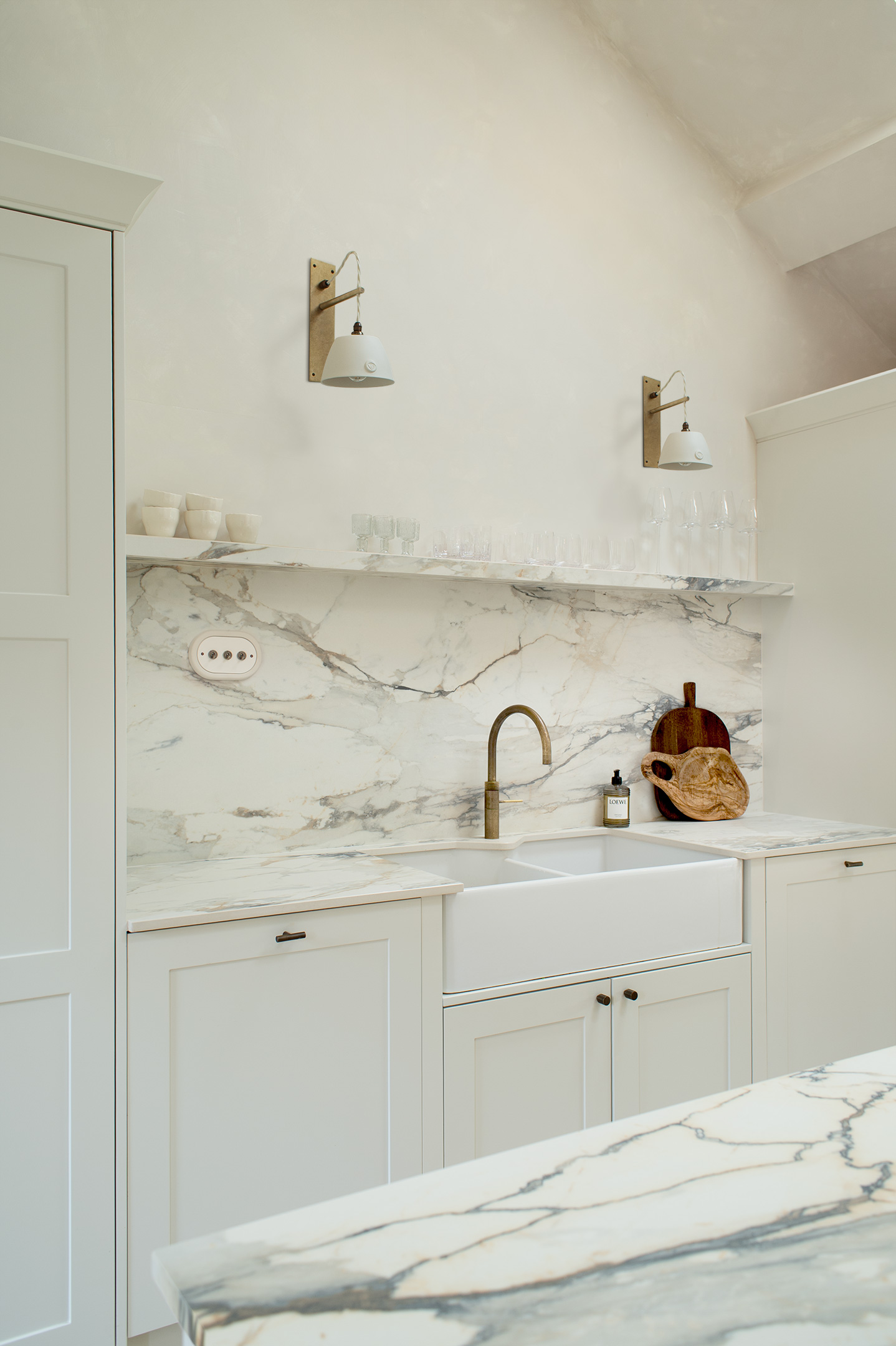 Gemma styled Boxted Giselle wall lights in the bedrooms and bathroom, pairing their opulent form with marble, stone, and ceramic textures. The result is understated indulgence, softened by natural materials.
