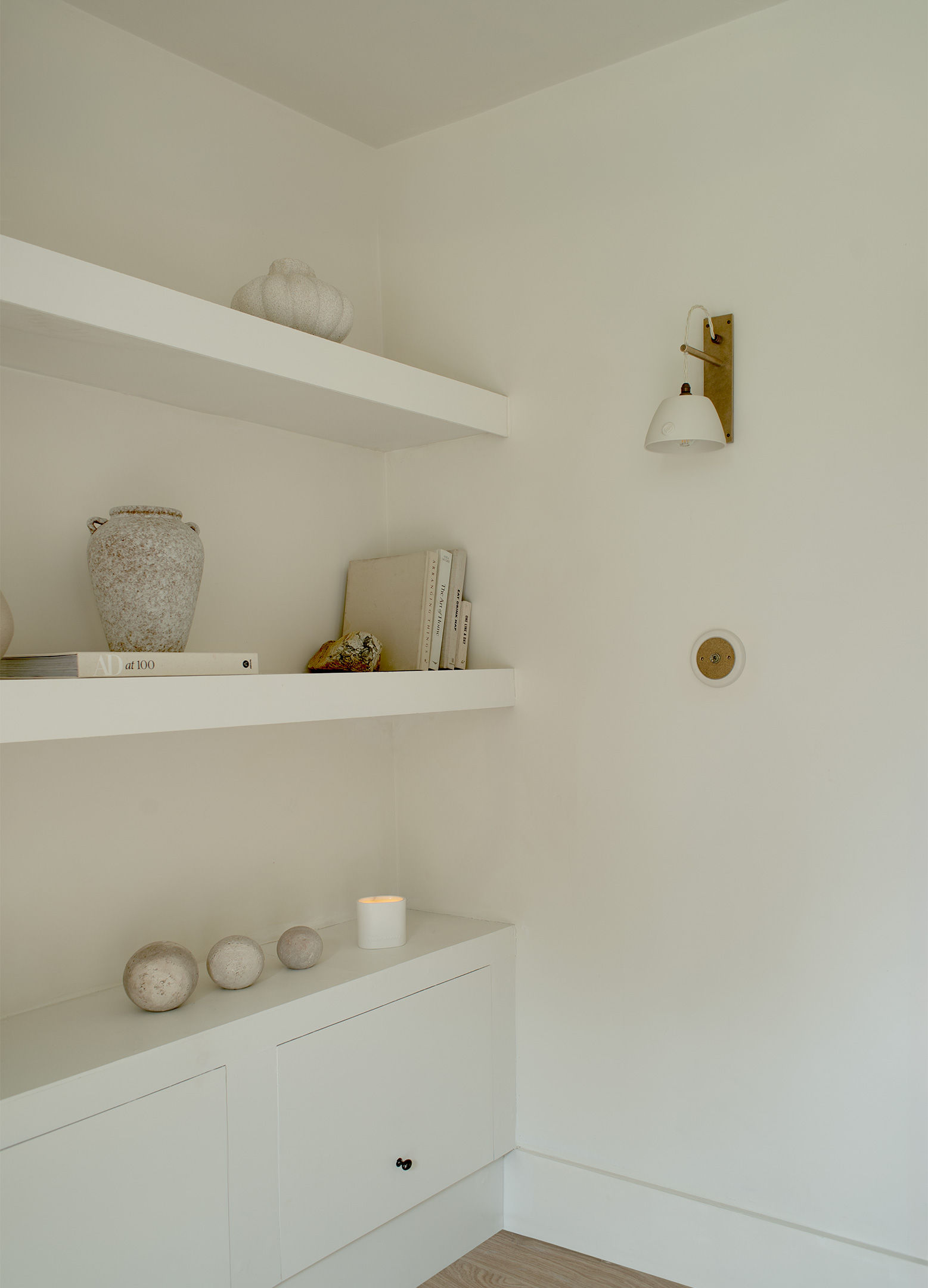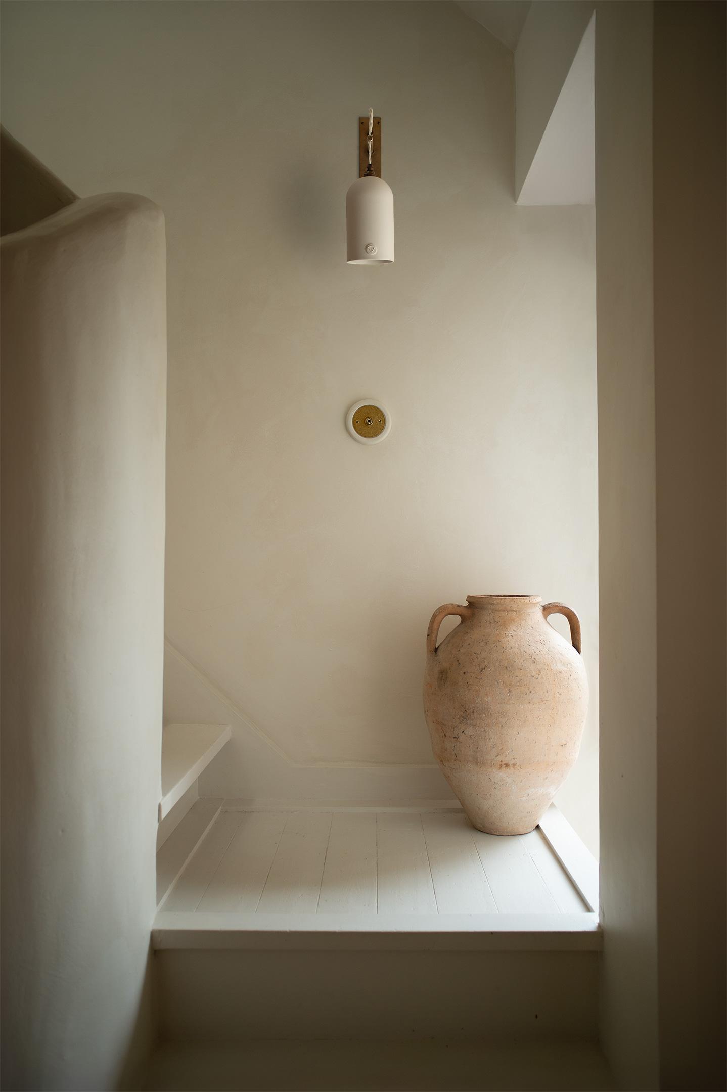 A snug repeats the Boxted Cottage wall lights, reinforcing the home’s visual language, while the ground floor hallway is a showstopper. A sculptural lime-rendered staircase is paired with the Boxted Bronte wall light, its raw porcelain form echoing the architecture itself. Here, a porcelain and brass switch becomes like jewellery on a gown, a single note of quiet luxury against simplicity.