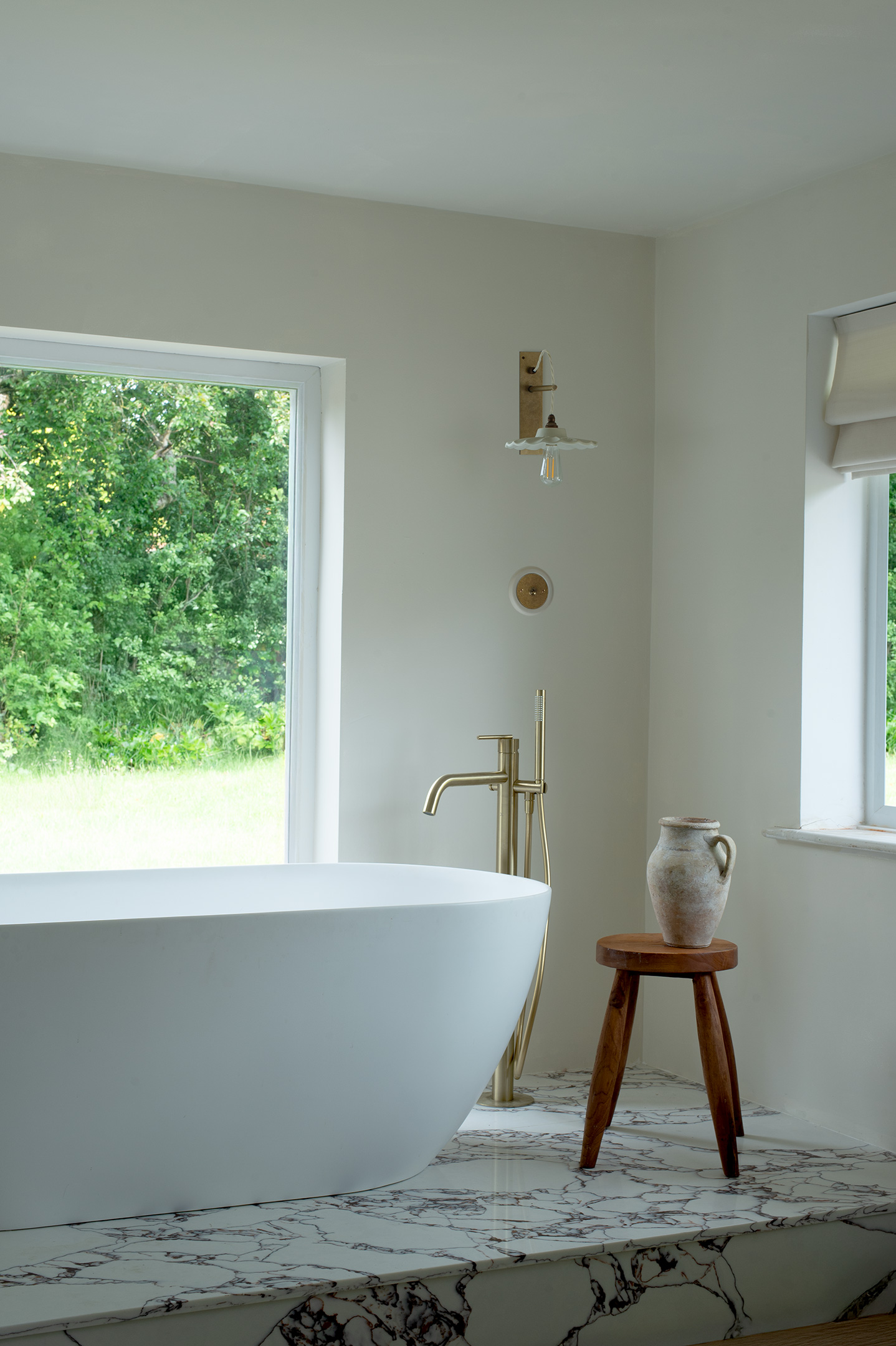 As Gemma walked us through, her natural creativity shone in the effortless way Lam Lighting has been woven into the spaces. In the kitchen, two Boxted Cottage wall lights are placed high above the shelving, their geometric brackets echoing the sharp lines of the cabinetry. In raw antiqued brass and unglazed porcelain, they sit beautifully within a palette of marble and lime plaster. Over the marble island, Heathcliff pendants bring quiet drama, their softened silhouettes balancing functionality with elegance. The scheme is tied together with porcelain light switches, playfully mixing white powder-coated versions with brass toggles alongside antiqued raw brass, adding punctuation and depth.