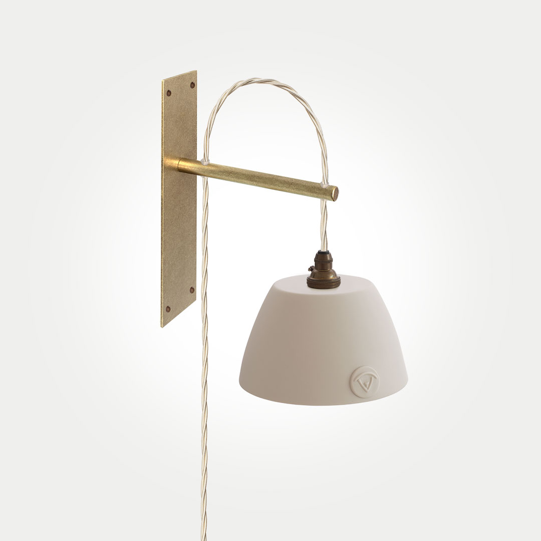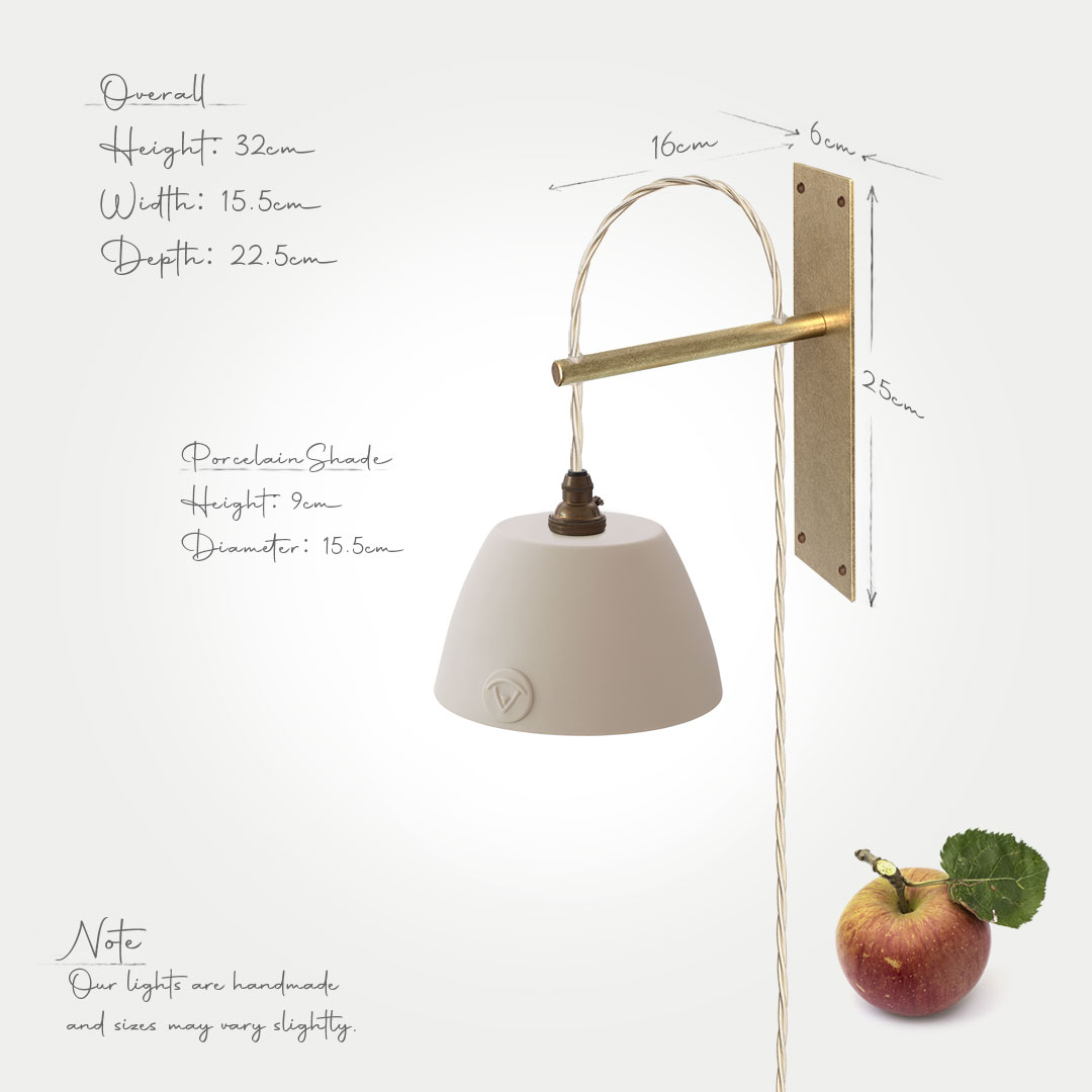 The Boxted wall bracket is meticulously handcrafted from solid brass and finished with a softly antiqued live patina. Designed with quiet, purposeful simplicity, it is paired with an elegantly understated Limoges porcelain shade.