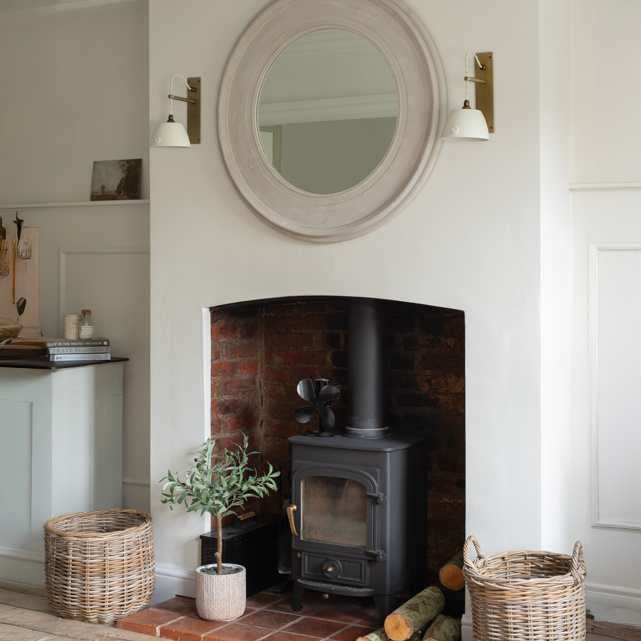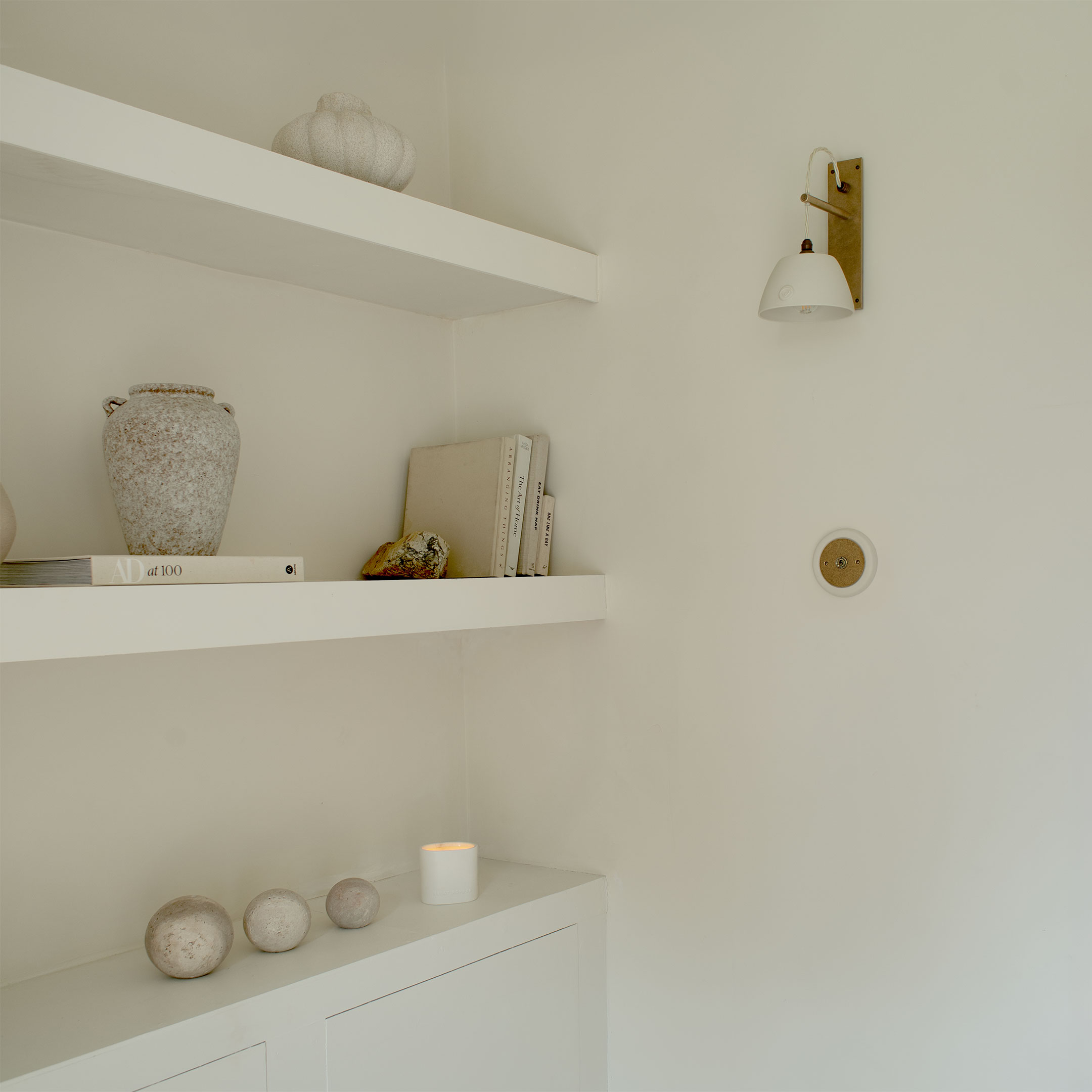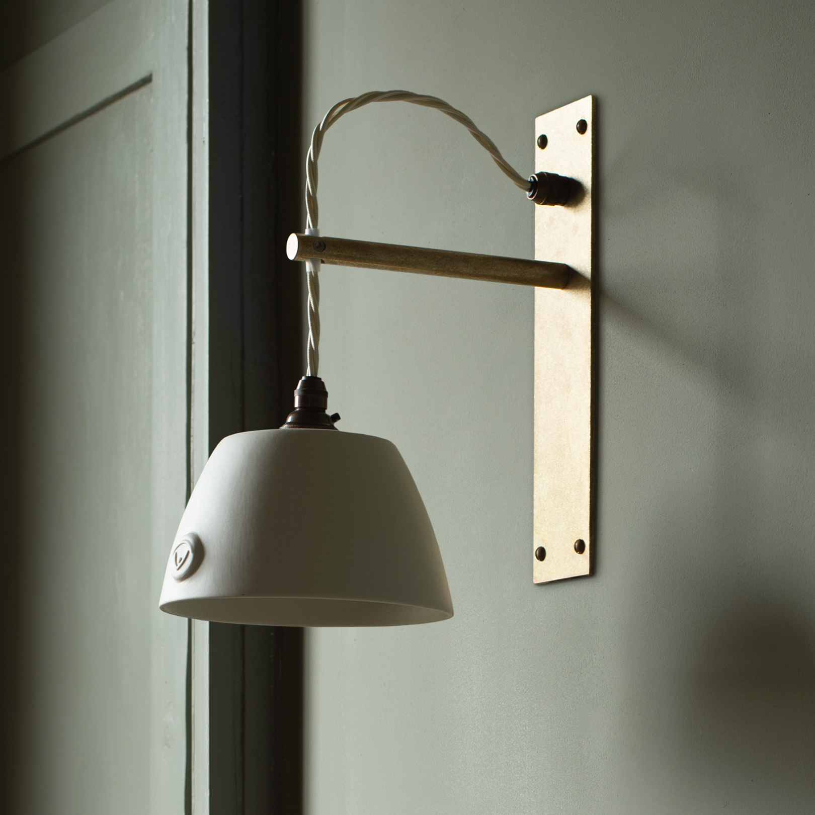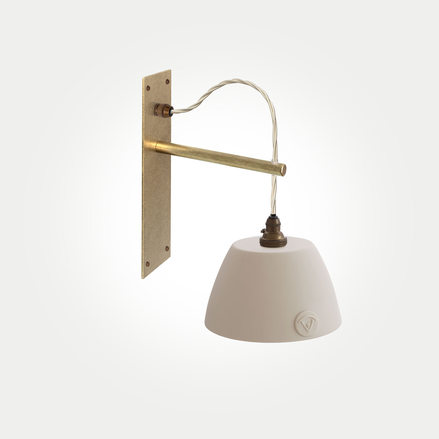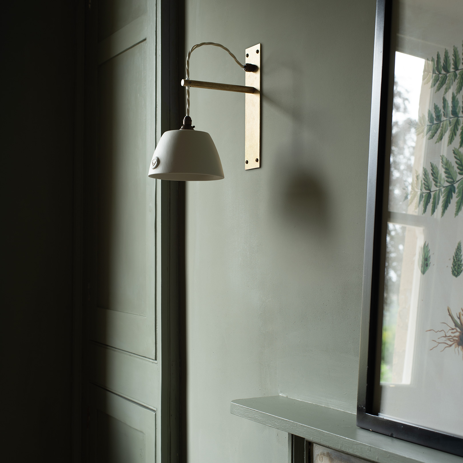 The Boxted wall bracket is meticulously handcrafted from solid brass and finished with a softly antiqued live patina. Designed with quiet, purposeful simplicity, it is paired with an elegantly understated Limoges porcelain shade.