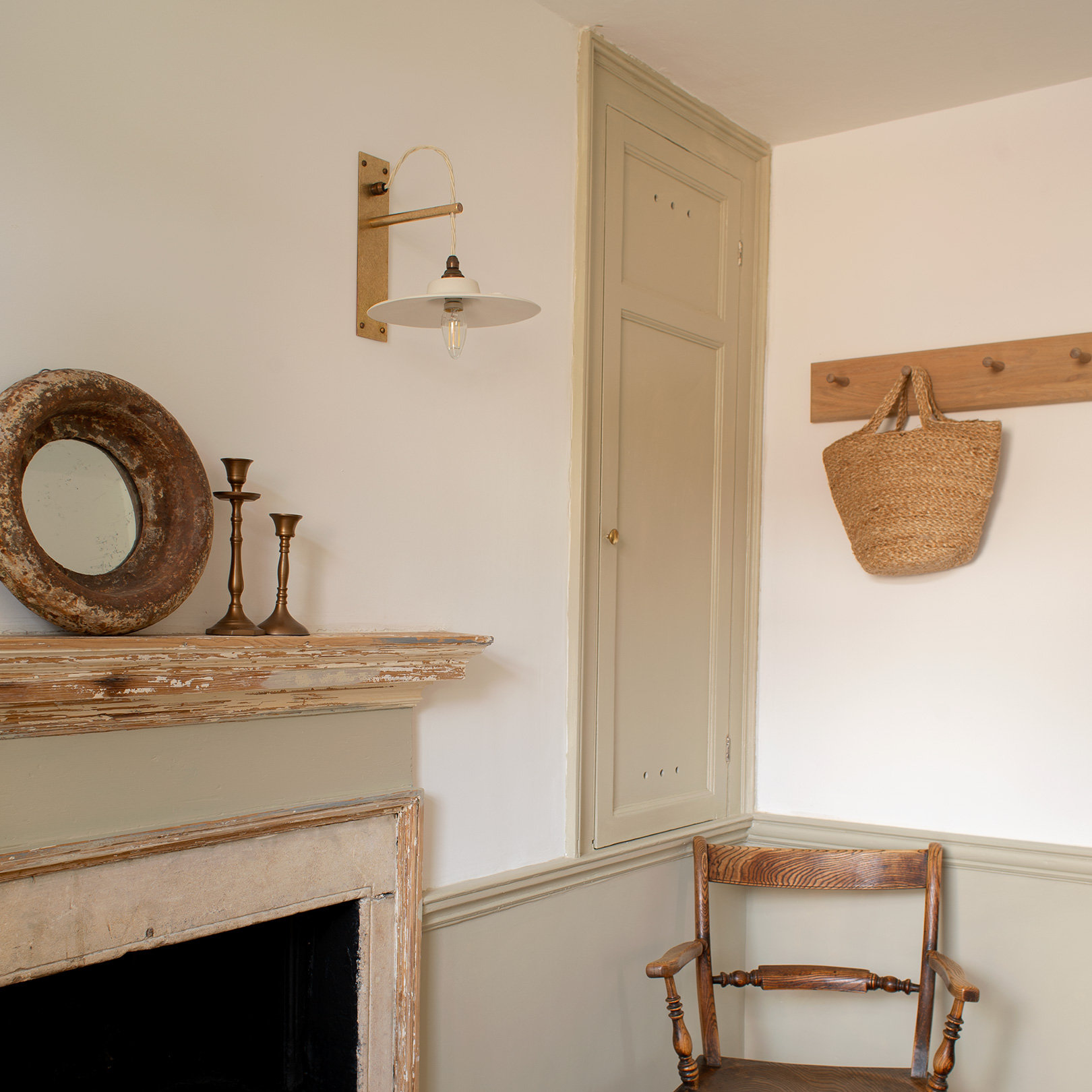 The Boxted wall bracket is meticulously handcrafted from solid brass and finished with a softly antiqued live patina. Designed with quiet, purposeful simplicity, it is paired with an elegantly understated Limoges porcelain shade.