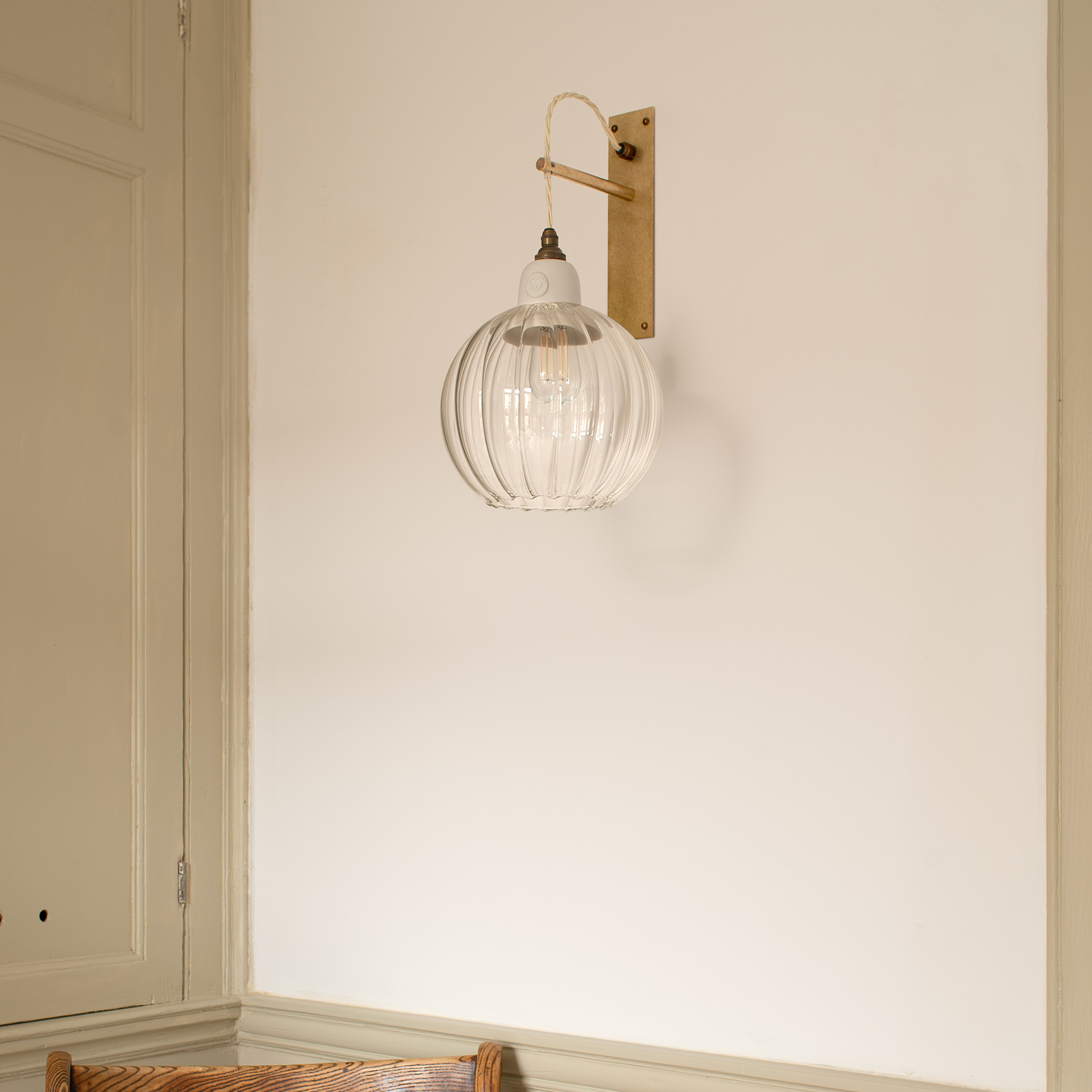 The Boxted wall bracket is meticulously handcrafted from solid brass and finished with a softly antiqued live patina. Designed with quiet, purposeful simplicity, it is paired with an elegantly understated Limoges porcelain shade.