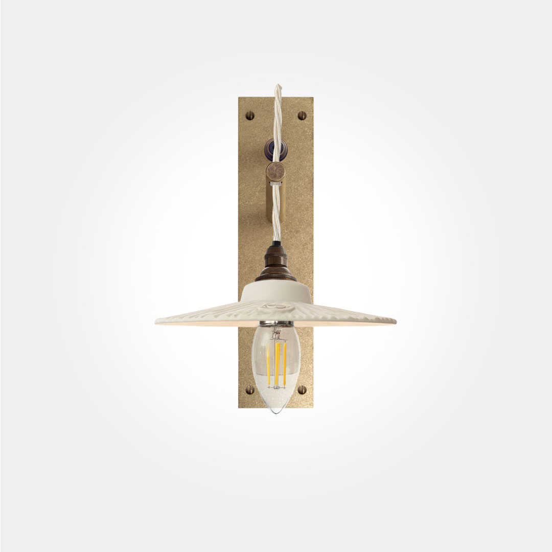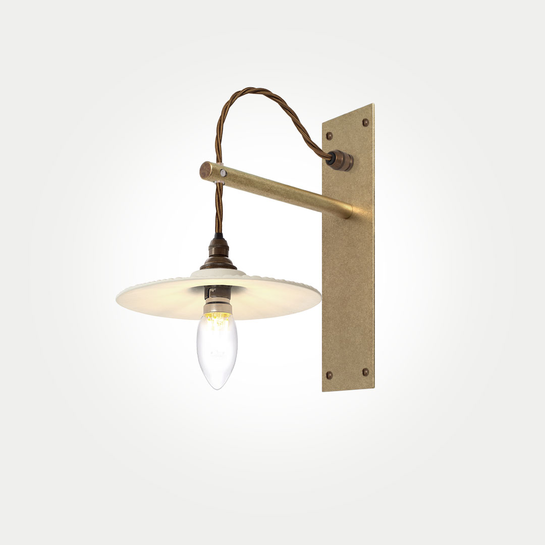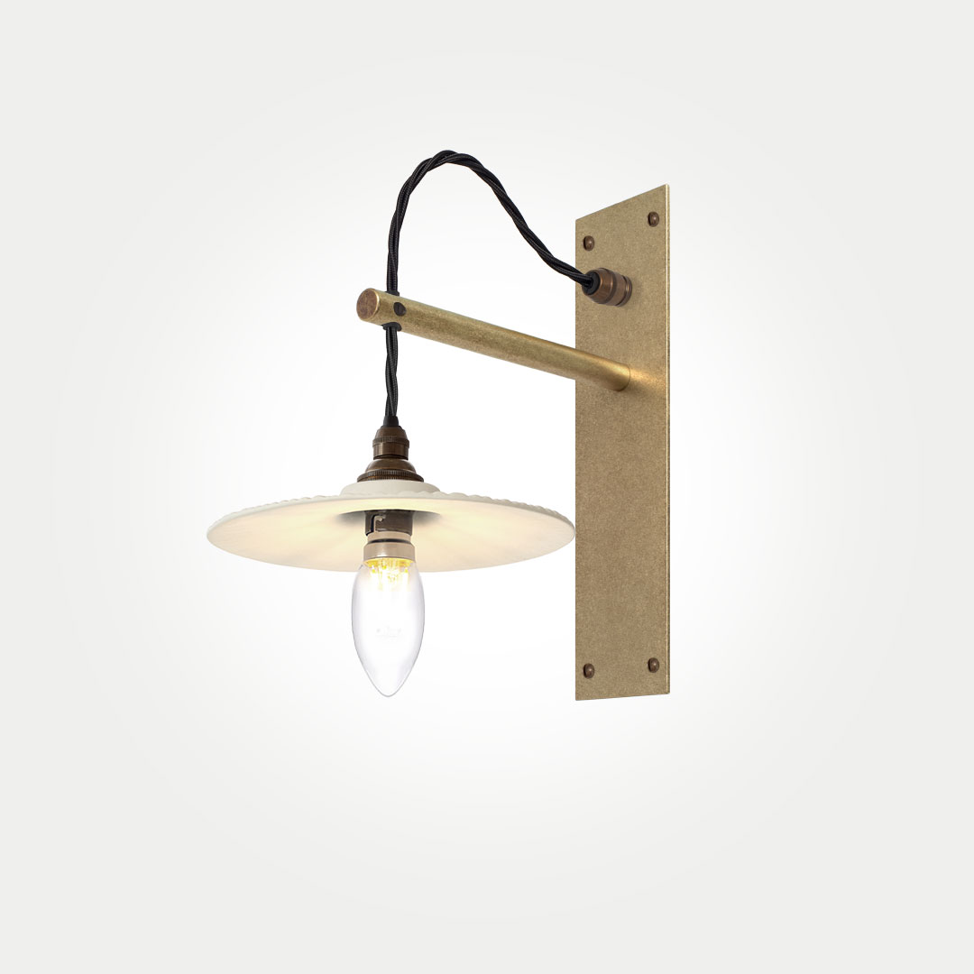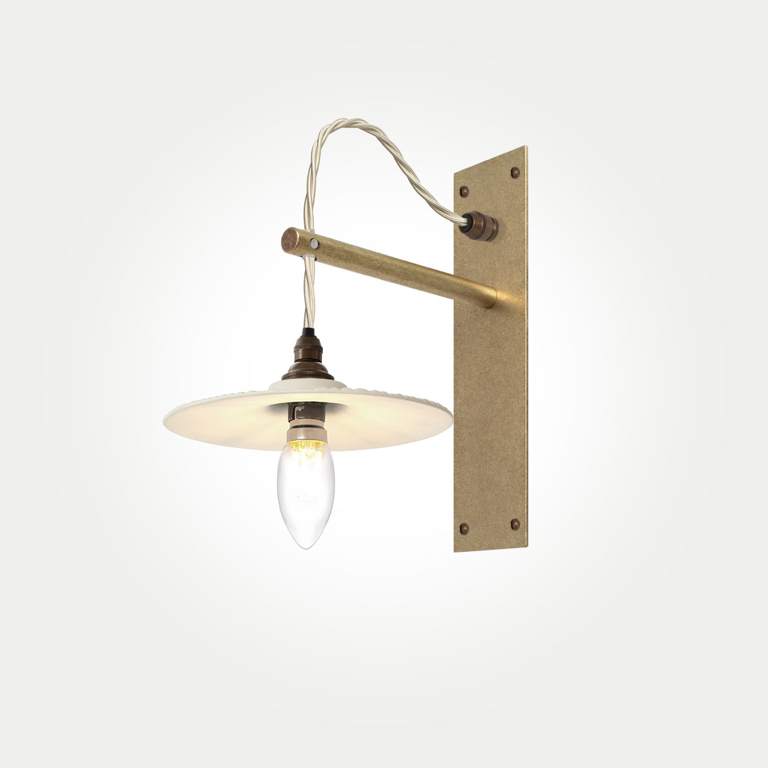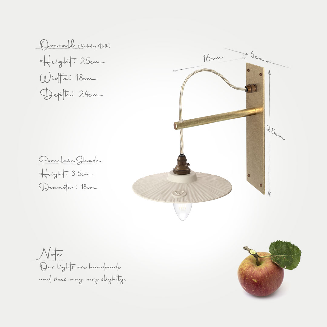 The Boxted wall bracket is meticulously handcrafted from solid brass and finished with a softly antiqued live patina. Designed with quiet, purposeful simplicity, it is paired with an elegantly understated Limoges porcelain shade.