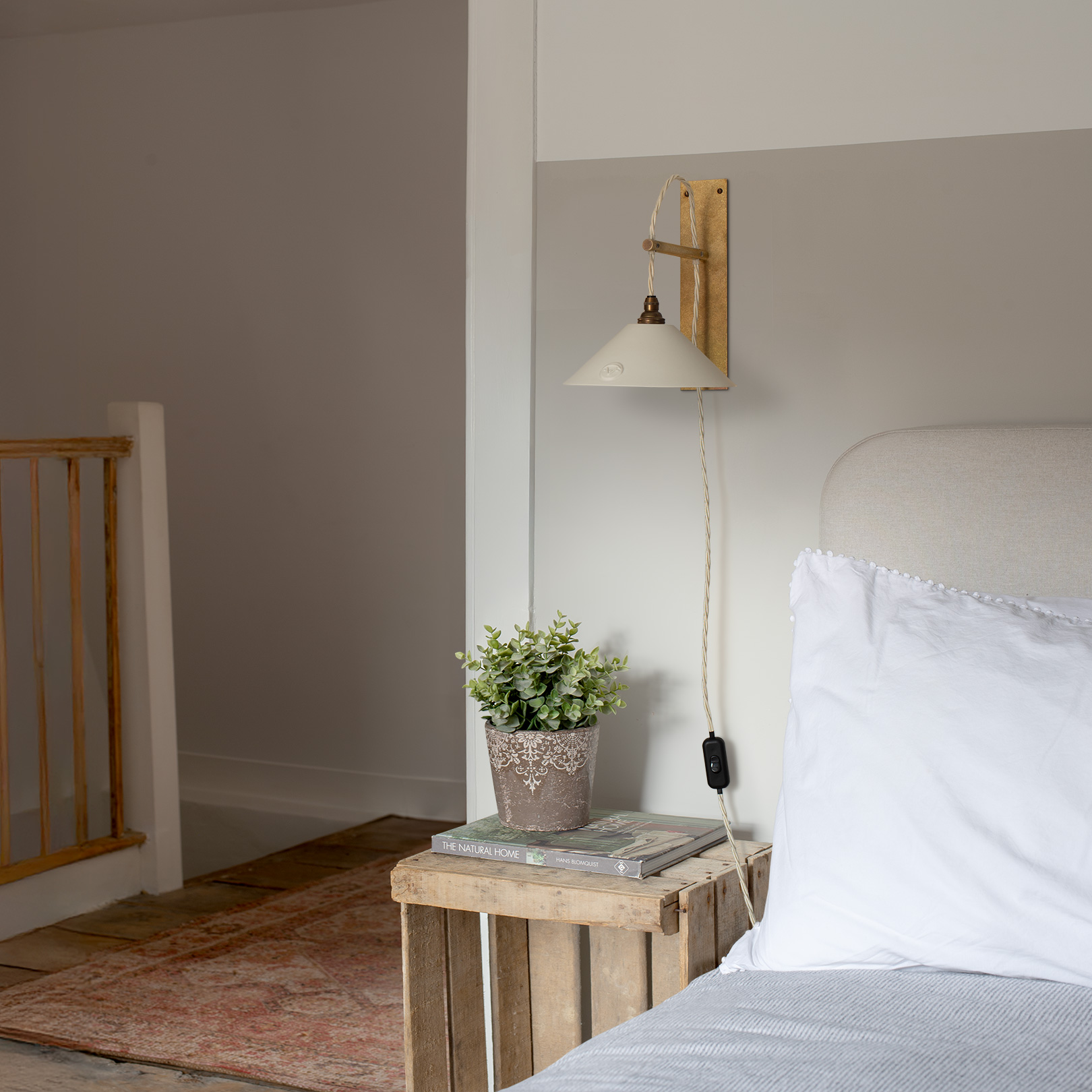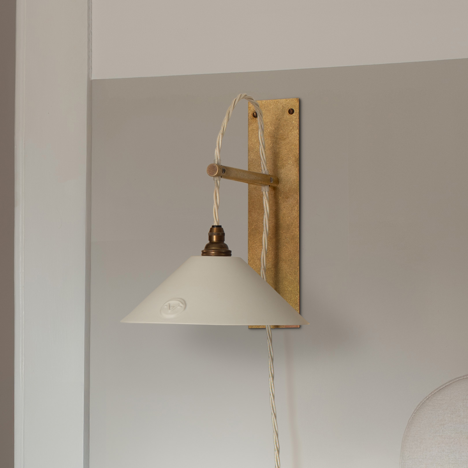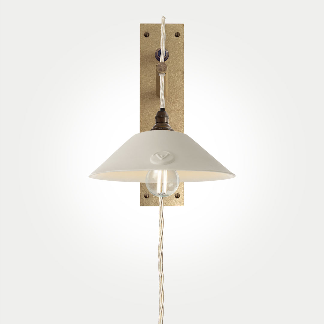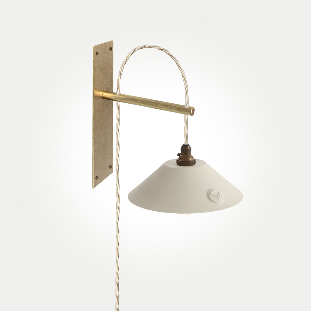 The Boxted wall bracket is meticulously handcrafted from solid brass and finished with a softly antiqued live patina. Designed with quiet, purposeful simplicity, it is paired with an elegantly understated Limoges porcelain shade.