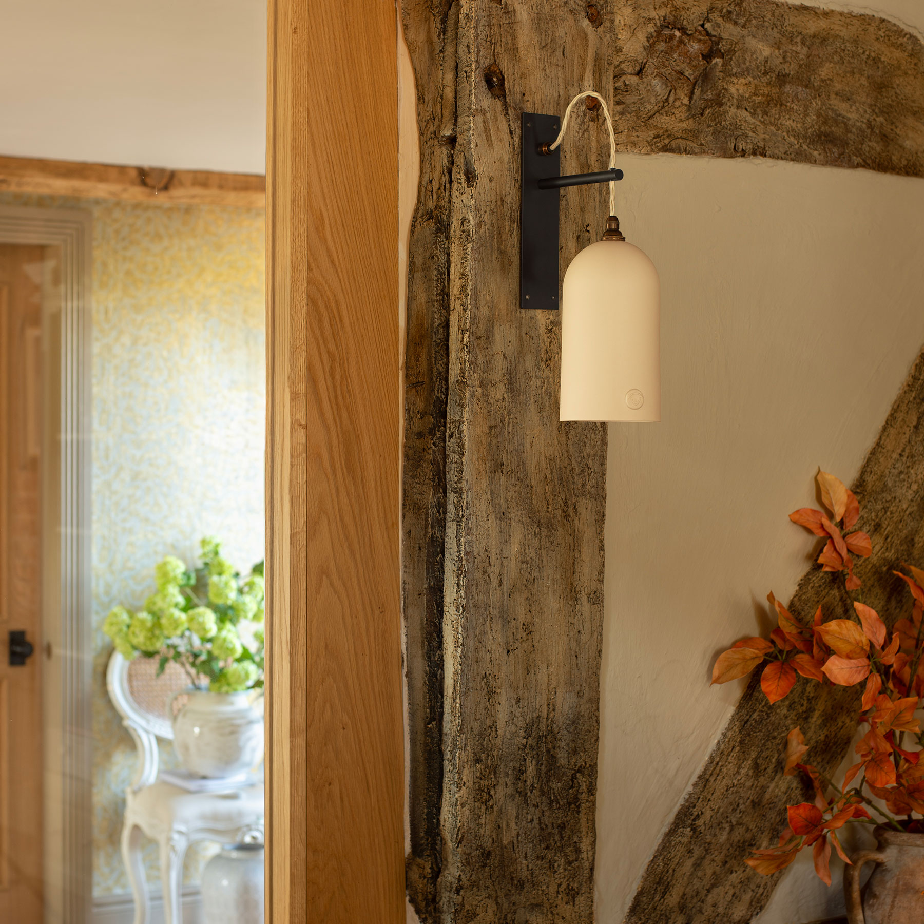 The Nayland Bronté Wall Light is a stylish and versatile lighting choice. The shade is perfectly proportioned with a domed top and sleek sides, creating an effortless style. Its simplistic curves and lines form an elegant silhouette, enhancing any room with quiet sophistication. Comprised of a handcrafted black, powder-coated metal wall bracket and a beautiful porcelain shade; the perfect blend of contemporary design and traditional elegance. Your choice of exposed, vintage braided cable is fully adjustable to suit your desired space and style. A wonderful alternative to a bedside or reading lamp, it is a statement piece that will bring a touch of modern luxury to any room of the home.