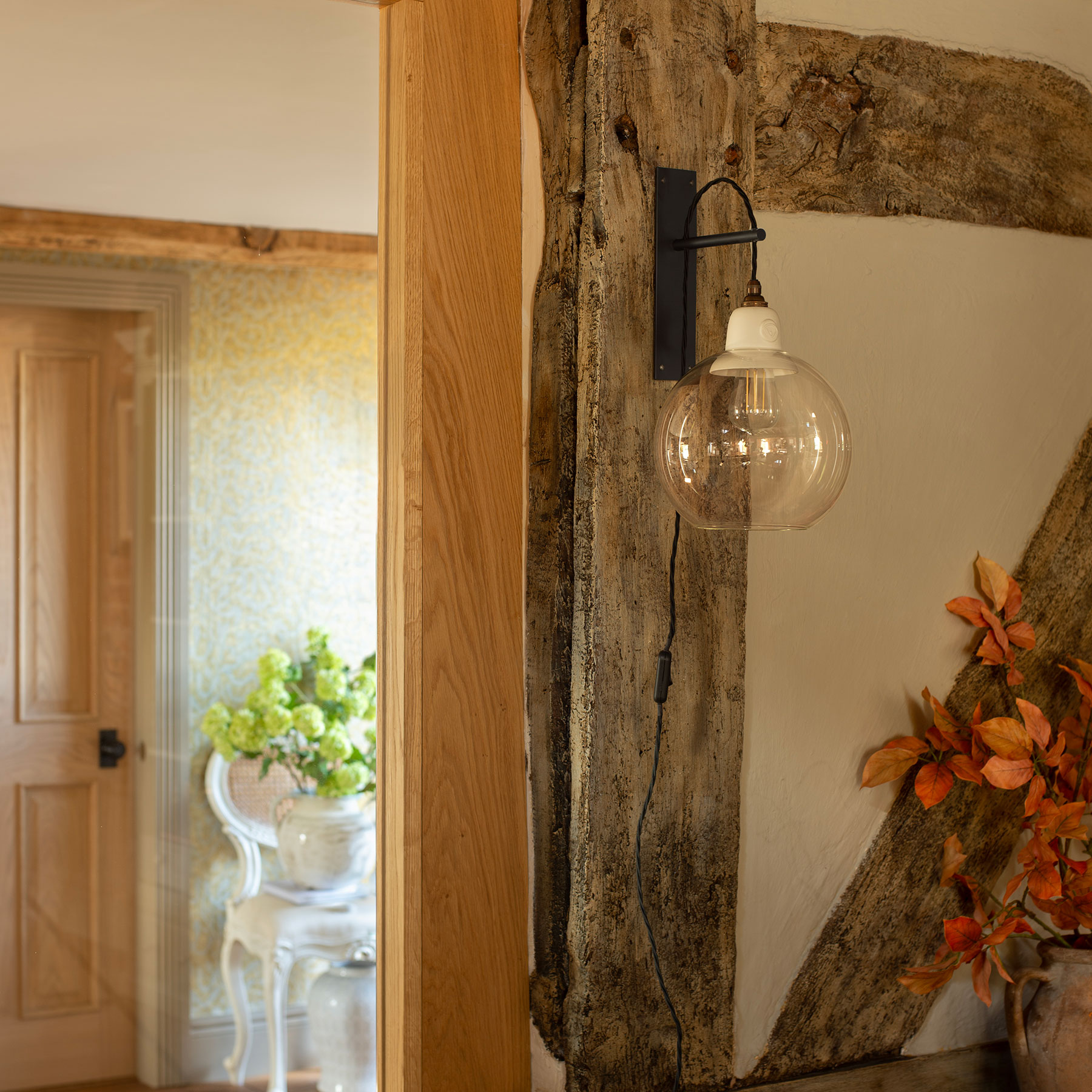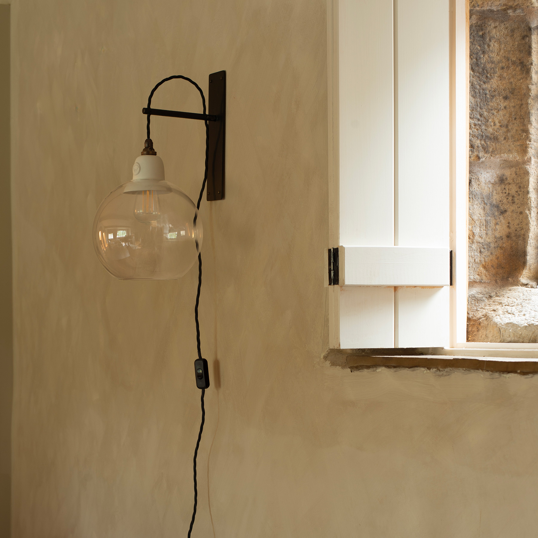 Designed to enable you to have a light where there is no existing supply in the wall. Simply plug into a nearby mains socket. The perfect blend of contemporary design and traditional charm, it is comprised of a black wall bracket and a beautifully handcrafted, porcelain gantry and handblown glass shade. The vintage braided cable is adjustable to suit your space and style. A wonderful alternative to a bedside or table lamp.