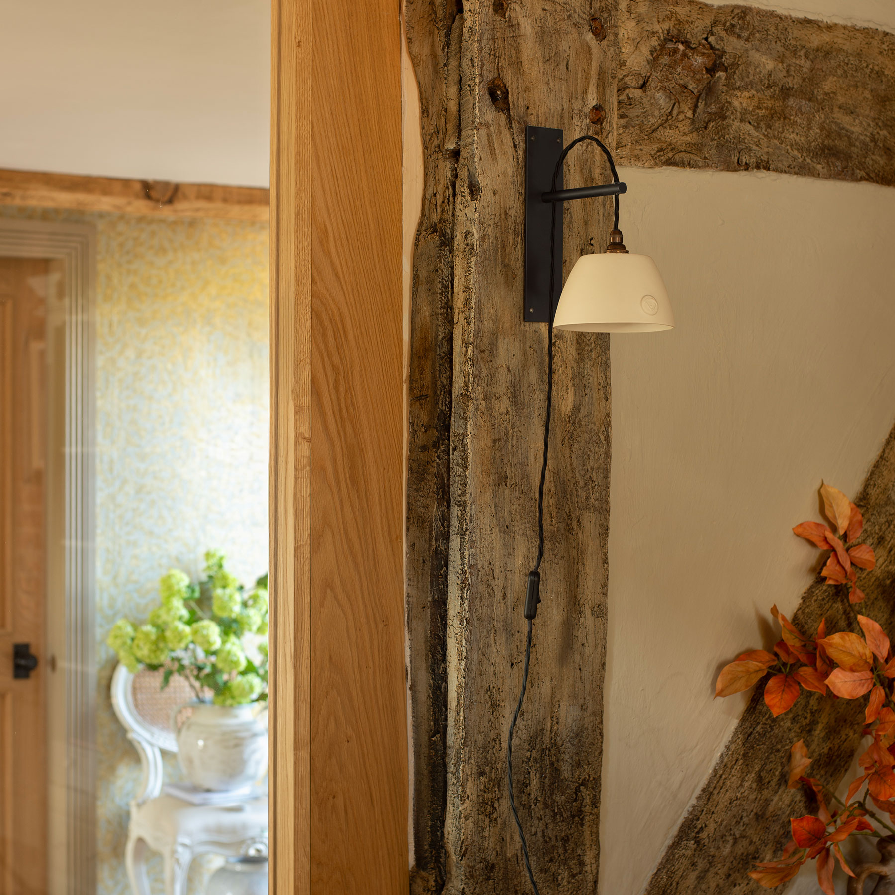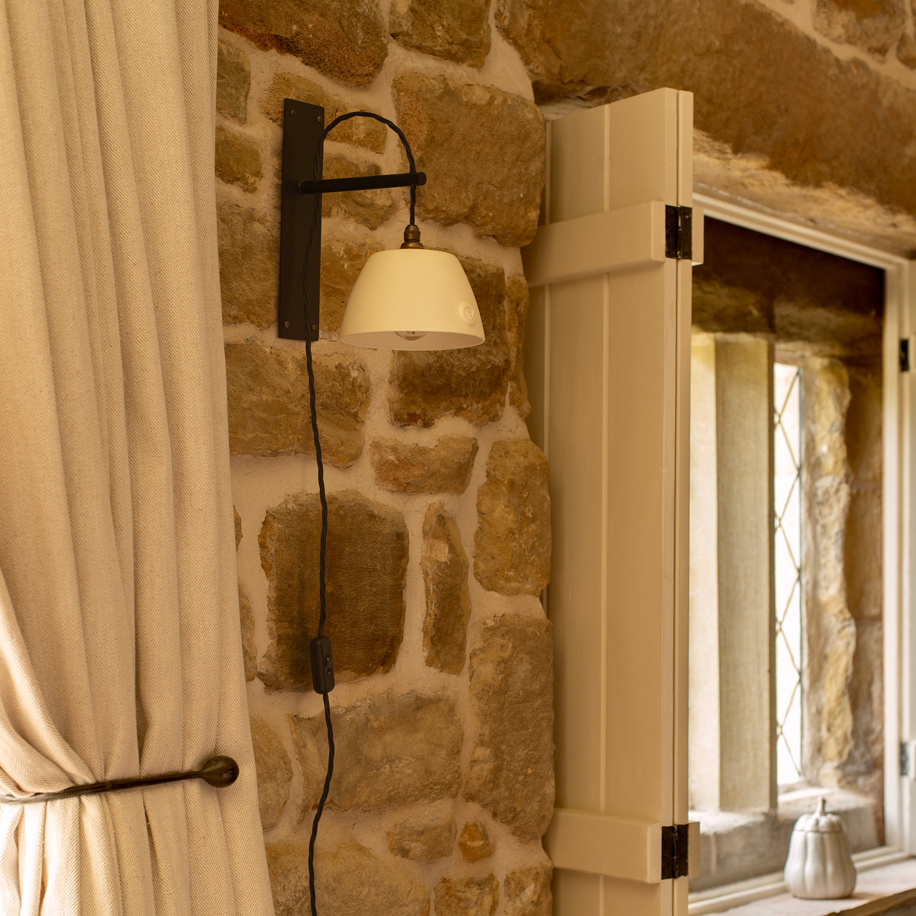 Designed to enable you to have a light where there is no existing supply in the wall. Simply plug into a nearby mains socket. The perfect blend of contemporary design and traditional charm, it is comprised of a black wall bracket and a beautifully handcrafted, porcelain shade. The exposed, vintage braided cable is adjustable to suit your space and style. A wonderful alternative to a bedside or table lamp.