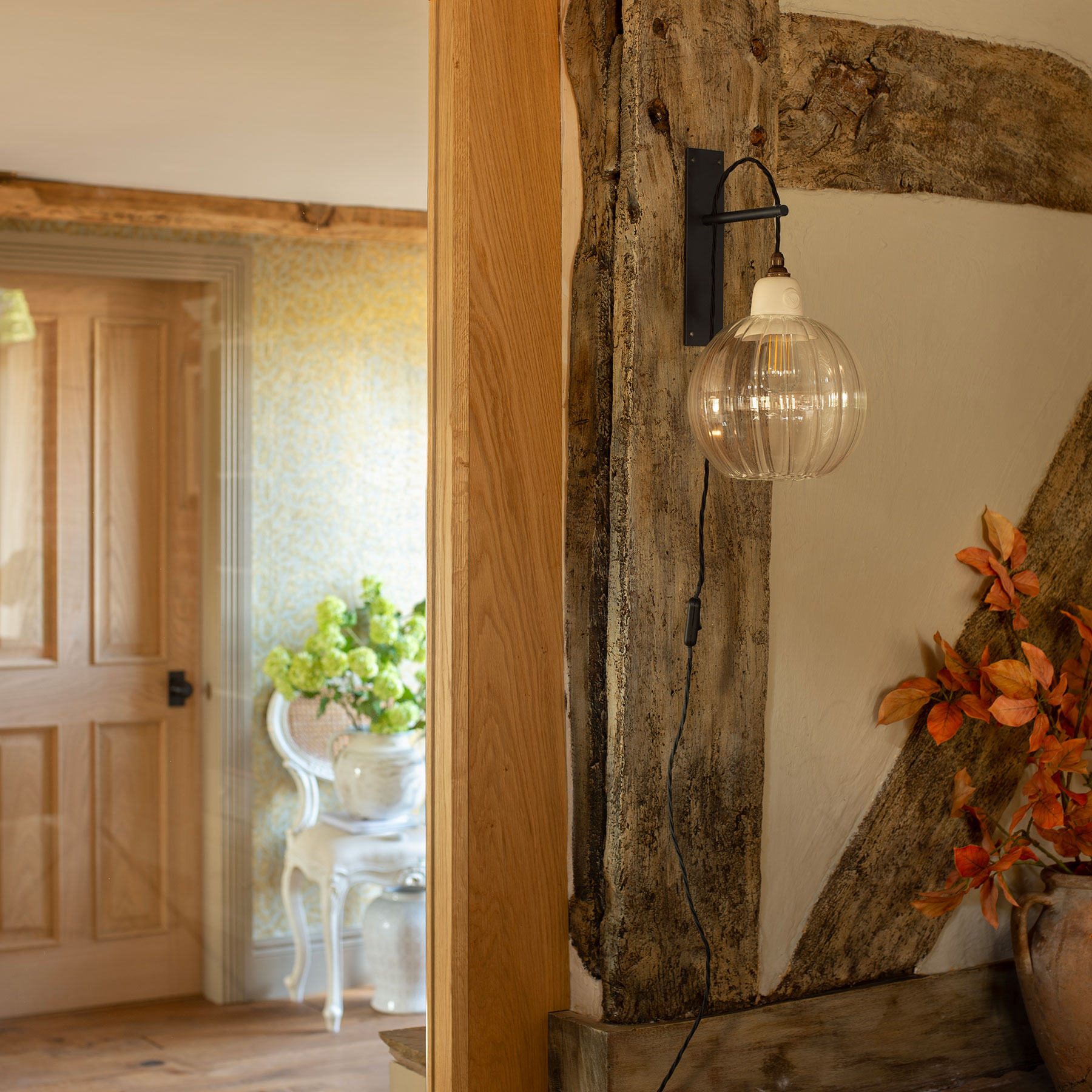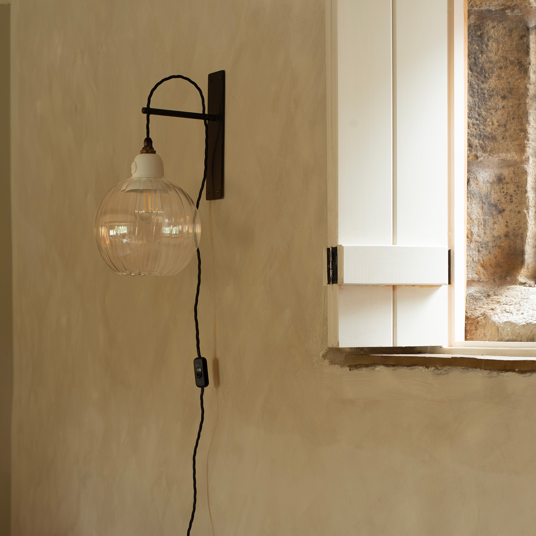 Designed to enable you to have a light where there is no existing supply in the wall. Simply plug into a nearby mains socket. The perfect blend of contemporary design and traditional charm, it is comprised of a black wall bracket and a beautifully handcrafted, porcelain gantry and handblown glass shade. The exposed, vintage braided cable is adjustable to suit your space and style. A wonderful alternative to a bedside or table lamp.